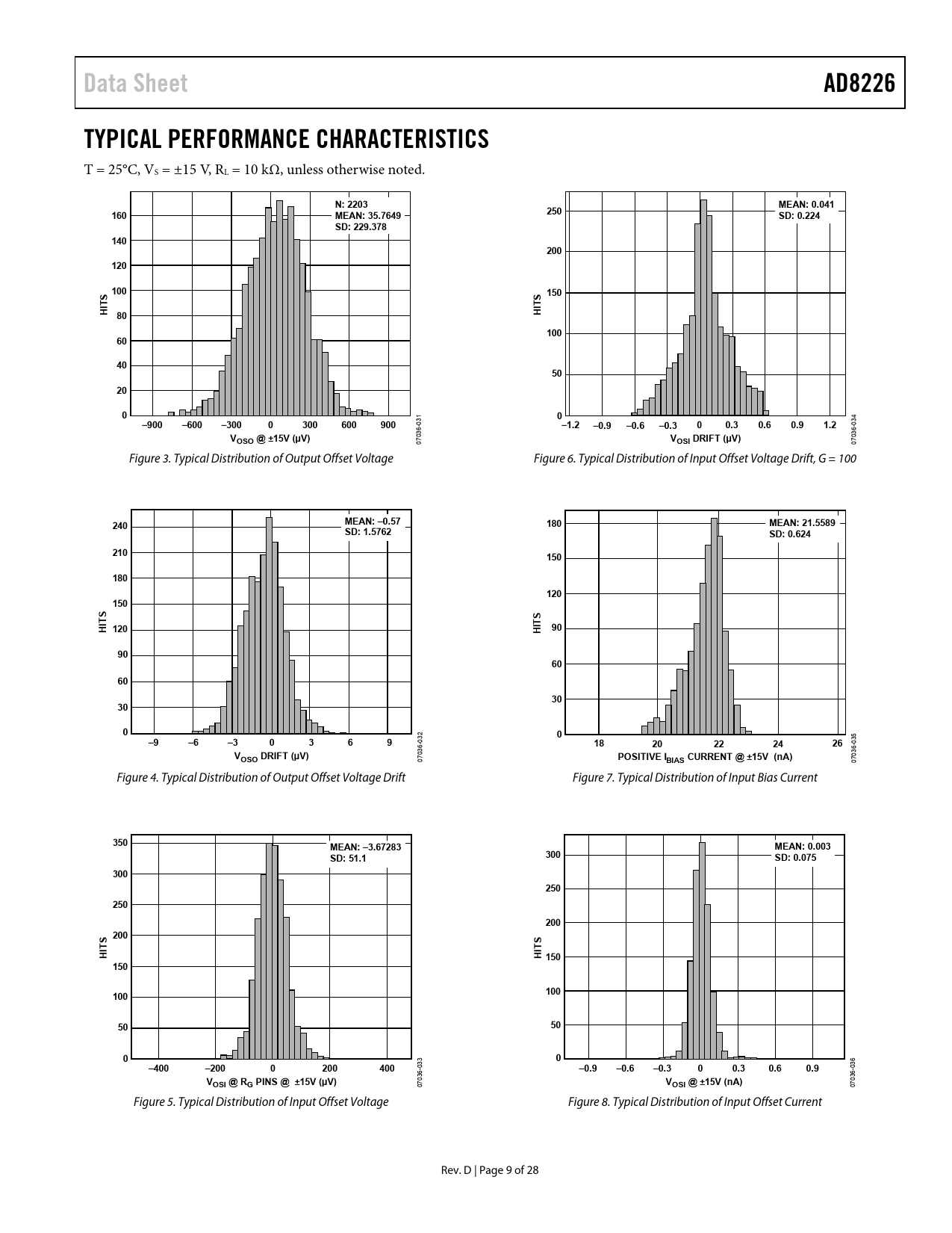 Data Sheet. AD8226. TYPICAL PERFORMANCE CHARACTERISTICS. N: 2203. MEAN: 0.041. 160. MEAN: 35.7649. 250. SD: 0.224. SD: 229.378. 140. 200. 120