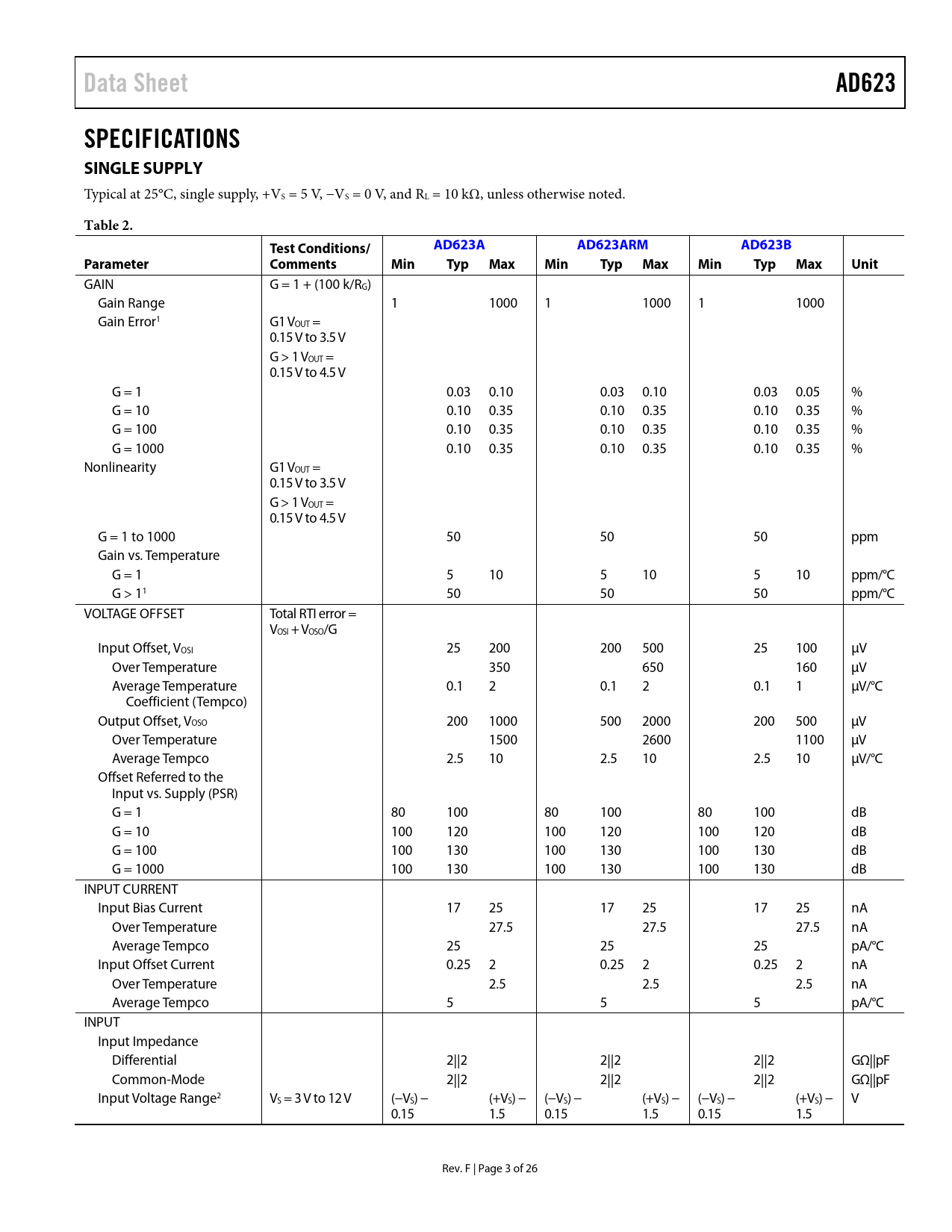 页数 / 页26 / 3 — Data Sheet. AD623. SPECIFICATIONS SINGLE SUPPLY. Table 2. Test …