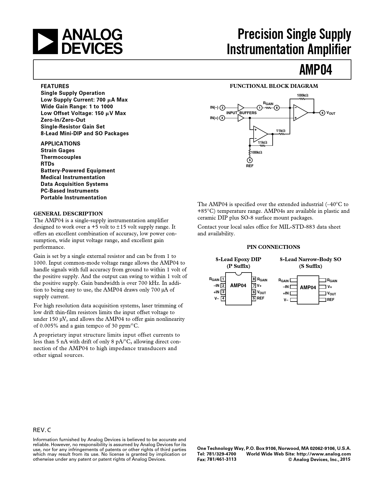 For high resolution data acquisition systems, laser trimming of low drift thin-film resistors limits the input offset voltage to under 150 µV, and allows the AMP04 to offer gain nonlinearity of 0.005% and a gain tempco of 30 ppm/°C. A proprietary input structure limits input offset currents to less than 5 nA with drift of only 8 pA/°C, allowing direct con- nection of the AMP04 to high impedance transducers and other signal sources. REV. C Information furnished by Analog Devices is believed to be accurate and reliable. However, no responsibility is assumed by Analog Devices for its use, nor for any infringements of patents or other rights of third parties