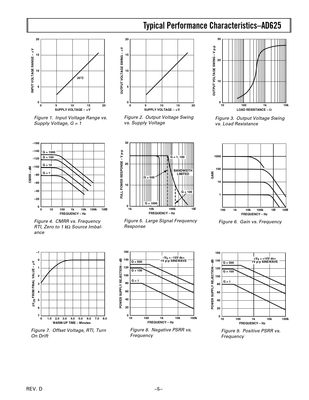 Typical Performance Characteristics–AD625202030VVV p-p––1515–20101025C1055INPUT VOLTAGE RANGEOUTPUT VOLTAGE SWINGOUTPUT VOLTAGE SWING0000510152005101520101001k10kSUPPLY VOLTAGE –VSUPPLY VOLTAGE –VLOAD RESISTANCE – Figure 1. Input Voltage Range vs. Figure 2. Output Voltage Swing Figure 3. Output Voltage Swing Supply Voltage, G = 1 vs. Supply Voltage vs. Load Resistance –16030–140G = 1000G = 1, 1001000–120G = 100V p-p –G = 1020–100dM100–BANDWIDTHG = 1–80LIMITEDG = 500GAINCMRR–601010–40G = 1001FULL POWER RESPONSE–20G = 1000000101001k10k100k10M1k10k100k1M1001k10k100k1M10MFREQUENCY – HzFREQUENCY – HzFREQUENCY – Hz Figure 4. CMRR vs. Frequency Figure 5. Large Signal Frequency Figure 6. Gain vs. Frequency RTI, Zero to 1 kΩ Source Imbal- Response ance –1160160–V0140S = –15V dc++VS = +15V dc+V1V p-p SINEWAVE140dBG = 5001V p-p SINEWAVEdBG = 500–––1120120G = 100G = 1002100100G = 1G = 13808046060FROM FINAL VALUE54040OSV6POWER SUPPLY REJECTION20POWER SUPPLY REJECTION2070001.02.03.04.05.06.07.08.0101001k10k100k101001k10k100kWARM-UP TIME – MinutesFREQUENCY – HzFREQUENCY – Hz Figure 7. Offset Voltage, RTI, Turn Figure 8. Negative PSRR vs. Figure 9. Positive PSRR vs. On Drift Frequency Frequency REV. D –5–