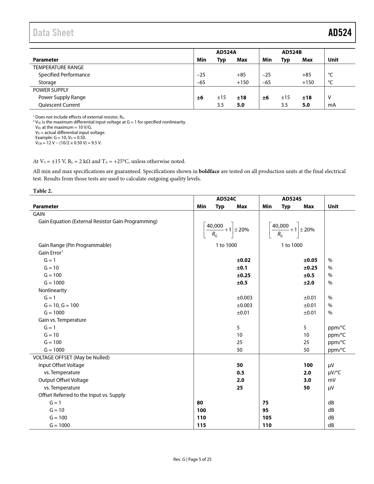 Data Sheet AD524 AD524A AD524B Parameter Min Typ Max Unit ±18 5.0 boldface Table 2 AD524C AD524S ±0.02 ±0.05 ±0.1 ±0.25 ±0.5 ±2.0 100 0.5 2.0