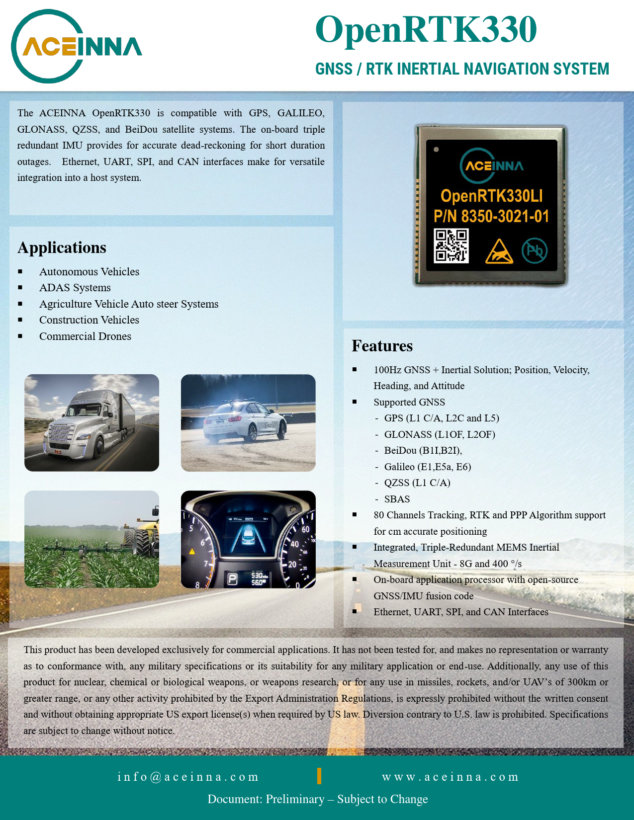 100Hz GNSS + Inertial Solution; Position, Velocity, Heading, and Attitude  Supported GNSS - GPS (L1 C/A, L2C and L5) - GLONASS (L1OF, L2OF) - BeiDou (B1I,B2I), - Galileo (E1,E5a, E6) - QZSS (L1 C/A) - SBAS  80 Channels Tracking, RTK and PPP Algorithm support for cm accurate positioning  Integrated, Triple-Redundant MEMS Inertial Measurement Unit - 8G and 400 °/s  On-board application processor with open-source GNSS/IMU fusion code  Ethernet, UART, SPI, and CAN Interfaces This product has been developed exclusively for commercial applications. It has not been tested for, and makes no representation or warranty as to conformance with, any military specifications or its suitability for any military application or end-use. Additionally, any use of this product for nuclear, chemical or biological weapons, or weapons research, or for any use in missiles, rockets, and/or UAV’s of 300km or greater range, or any other activity prohibited by the Export Administration Regulations, is expressly prohibited without the written consent and without obtaining appropriate US export license(s) when required by US law. Diversion contrary to U.S. law is prohibited. Specifications are subject to change without notice. i n f o @ a c e i n n a . c o m w w w . a c e i n n a . c o m Document: Preliminary – Subject to Change
