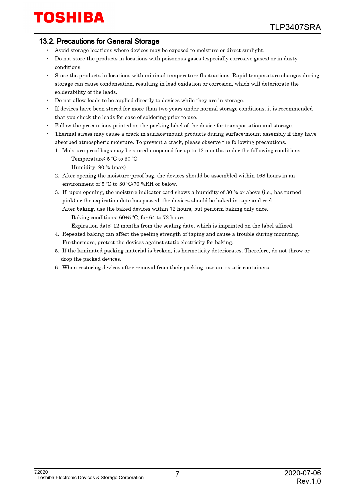 TLP3407SRA. 13.2. Precautions. for. General. Storage. •. Avoid. storage. locations. where. devices. may. be. exposed. to. moisture. or. direct. sunlight. •. Do