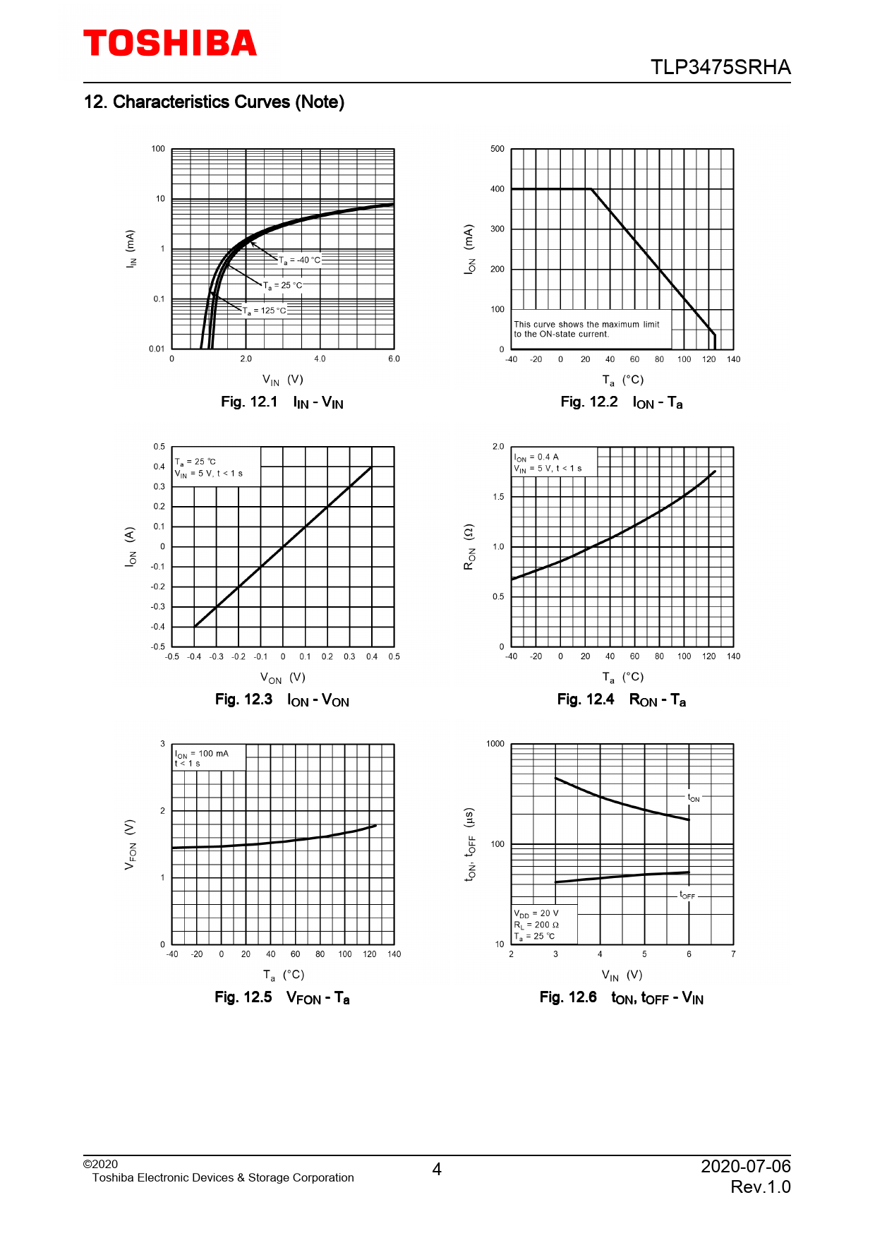 TLP3475SRHA. 12. Characteristics. Curves. (Note). Fig. 12.1. IIN. -. VIN. Fig. 12.2. ION. -. Ta. Fig. 12.3. ION. -. VON. Fig. 12.4. RON. -. Ta. Fig. 12.5. VFON. -. Ta. Fig. 12.6. tON,