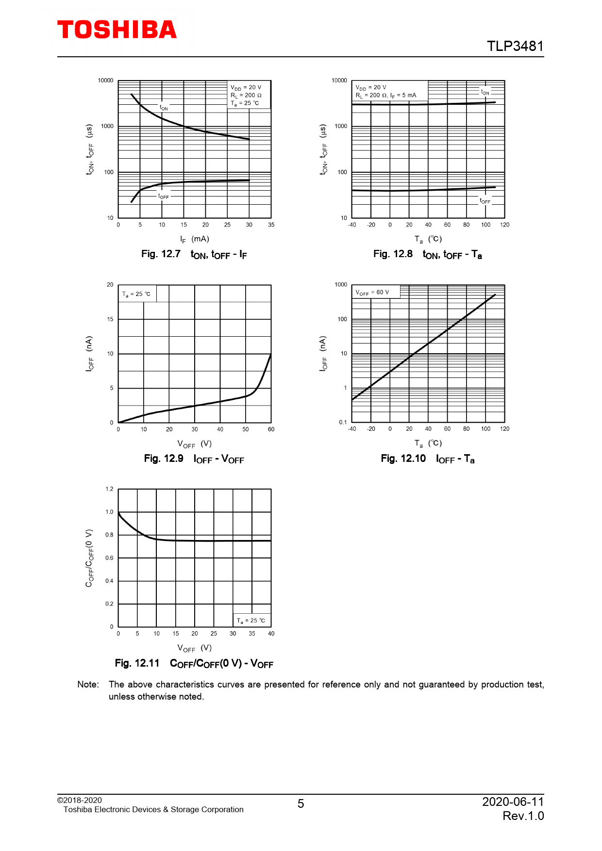 TLP3481. Fig. 12.7. tON,. tOFF. -. IF. Fig. 12.8. tON,. tOFF. -. Ta. Fig. 12.9. IOFF. -. VOFF. Fig. 12.10. IOFF. -. Ta. Fig. 12.11. COFF/COFF(0. V). -. VOFF. Note:. The. above