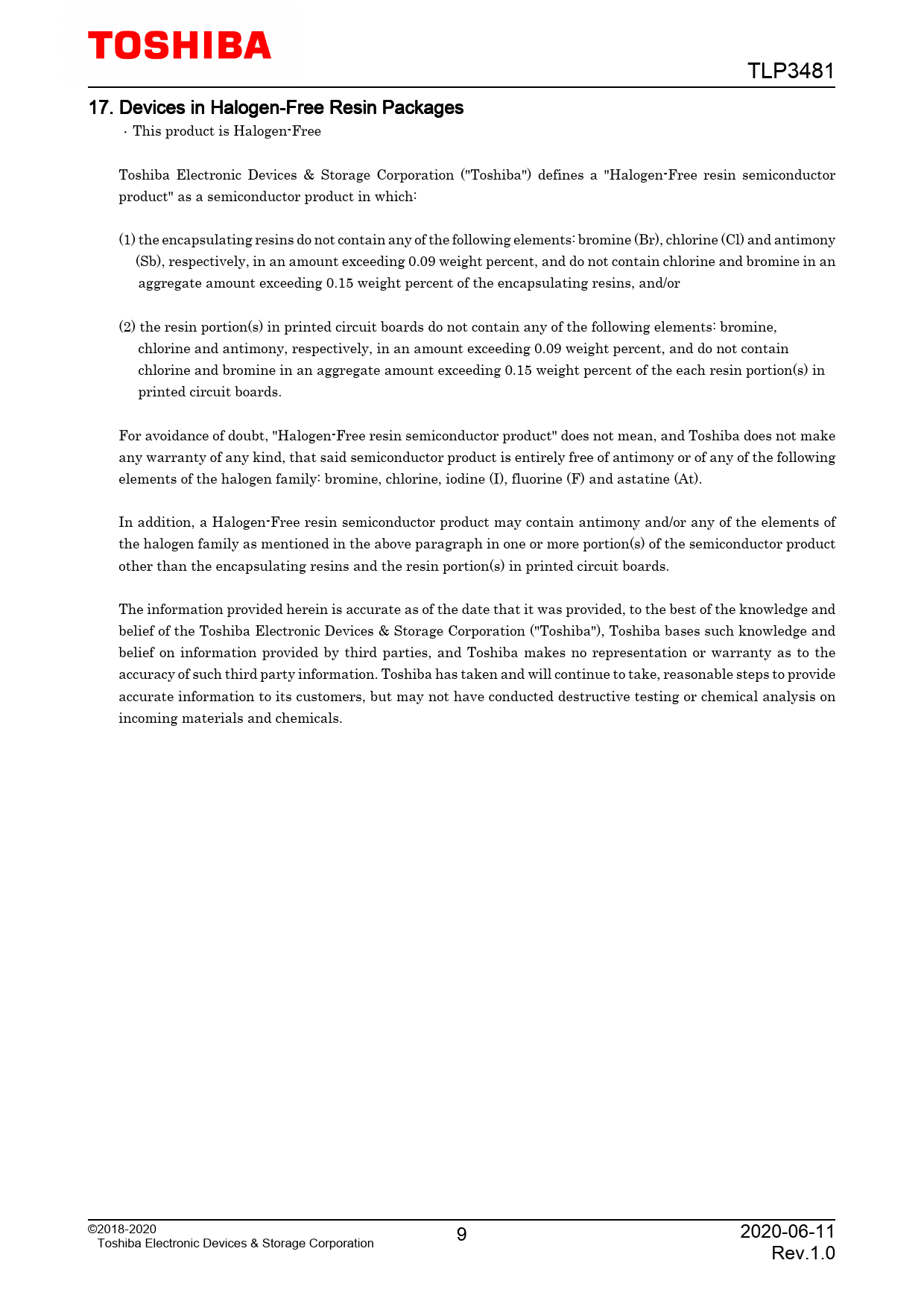 TLP3481 17. Devices in Halogen-Free Resin Packages This product is Halogen-Free Toshiba Electronic Devices & Storage Corporation ("Toshiba") defines a "Halogen-Free resin semiconductor product" as a semiconductor product in which: (1) the encapsulating resins do not contain any of the following elements: bromine (Br), chlorine (Cl) and antimony (Sb), respectively, in an amount exceeding 0.09 weight percent, and do not contain chlorine and bromine in an aggregate amount exceeding 0.15 weight percent of the encapsulating resins, and/or (2) the resin portion(s) in printed circuit boards do not contain any of the following elements: bromine, chlorine and antimony, respectively, in an amount exceeding 0.09 weight percent, and do not contain chlorine and bromine in an aggregate amount exceeding 0.15 weight percent of the each resin portion(s) in printed circuit boards. For avoidance of doubt, "Halogen-Free resin semiconductor product" does not mean, and Toshiba does not make any warranty of any kind, that said semiconductor product is entirely free of antimony or of any of the following elements of the halogen family: bromine, chlorine, iodine (I), fluorine (F) and astatine (At). In addition, a Halogen-Free resin semiconductor product may contain antimony and/or any of the elements of the halogen family as mentioned in the above paragraph in one or more portion(s) of the semiconductor product other than the encapsulating resins and the resin portion(s) in printed circuit boards. The information provided herein is accurate as of the date that it was provided, to the best of the knowledge and belief of the Toshiba Electronic Devices & Storage Corporation ("Toshiba"), Toshiba bases such knowledge and belief on information provided by third parties, and Toshiba makes no representation or warranty as to the accuracy of such third party information. Toshiba has taken and will continue to take, reasonable steps to provide accurate information to its customers, but may not have conducted destructive testing or chemical analysis on incoming materials and chemicals. ©2018-2020 9 2020-06-11 Toshiba Electronic Devices & Storage Corporation Rev.1.0