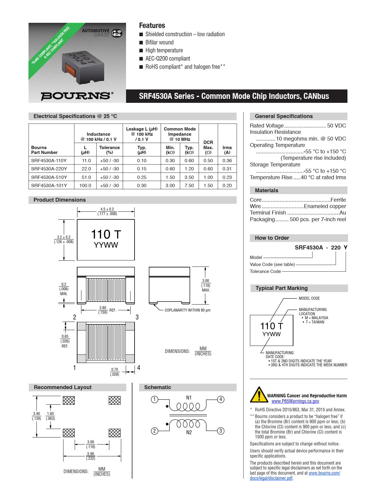 *RoHS COMPLIANTVERSIONSAVAILABLE*RoHS COMPLIANTLEAD FREEARELEAD FREEVERSIONSRoHS COMPLIANT*APPROVED*RoHS COMPLIANT& AECFeaturesAUTOMOTIVE GRADE n Shielded construction – low radiation n Bifilar wound , **HALOGEN FREE 1102024 n High temperature & AEC COMPLIANTT n AEC-Q200 compliant *RoHS COMPLIANT n RoHS compliant* and halogen 4.5 ± 0.2 free** *RoHS and (.177 ± .008) AEC-Q200 COMPLIANT*RoHS COMPLIANT and**HALOGEN FREESRF4530A Series - Common Mode Chip Inductors, 3.2 ± 0.2 (.126 ± .008) 110 T CANbus YYWW Electrical Specifications @ 25 °CGeneral Specifications Rated Voltage .. 50 VDC Leakage L (µH) Common ModeInductance@ 100 kHzImpedance Insulation Resistance @ 100 kHz / 0.1 V/ 0.1 V 3.00 0.2 @ 10 MHz ...10 megohms min. @ 50 VDC DCR (.118) BournsL (.008) 4.5 ± 0.2 ToleranceTyp.Min.Typ.Max.Irms Operating Temperature MAX. Part Number(µH) MIN. (.177 ± .008) (%)(µH)(k W )(k W )( W )(A) ..-55 °C to +150 °C SRF4530A-110Y 11.0 +50 / -30 0.10 0.30 0.60 0.50 0.36 (Temperature rise included) 3.80 REF. Storage Temperature SRF4530A-220Y 22.0 +50 / -30 0.15 0.60 1.20 COPLANARITY WITHIN 80 µm (.150) 0.60 0.31 ..-55 °C to +150 °C 2 3 3.2 ± 0.2 (.126 ± .008) 110 SRF4530A-510Y 51.0 T +50 / -30 0.25 1.50 3.50 1.00 0.23 Temperature Rise ...40 °C at rated Irms SRF4530A-101Y 100.0 YYWW +50 / -30 0.30 3.00 7.50 1.50 0.20 Materials 0.65 Product Dimensions (.026) Core ..Ferrite REF. Wire ..Enameled copper 4.5 ± 0.2 (.177 ± .008) Terminal Finish ...Au 3.00 Packaging ... 500 pcs. per 7-inch reel 0.2 1 (.118) 0.70 4 (.008) MAX. MIN. (.028) 3.2 ± 0.2 How to Order (.126 ± .008) 110 T 3.80 YYWW REF. COPLANARITY WITHIN 80 µm SRF4530A - 220 Y (.150) 2 3 Model Value Code (see table) Tolerance Code 0.65 (.026) 3.00 REF. 0.2 (.118) (.008) MAX. Typical Part Marking MIN. MODEL CODE 1 0.70 3.80 4 REF. COPLANARITY WITHIN 80 µm MANUFACTURING (.028) (.150) 2 3 LOCATION • M = MALAYSIA 110 T • T = TAIWAN 3.40 1.60 0.65 (.139) (.063) YYWW (.026) REF. DIMENSIONS: MM (INCHES) MANUFACTURING DATE CODE: 3.00 • 1ST & 2ND DIGITS INDICATE THE YEAR 1 (.118) • 3RD & 4TH DIGITS INDICATE THE WEEK NUMBER 0.70 4 5.90 (.028) (.232) Recommended LayoutSchematicWARNING Cancer and Reproductive Harm 1 N1 4 www.P65Warnings.ca.gov * RoHS Directive 2015/863, Mar 31, 2015 and Annex. 3.40 1.60 (.139) (.063) ** Bourns considers a product to be “halogen free” if (a) the Bromine (Br) content is 900 ppm or less; (b) the Chlorine (Cl) content is 900 ppm or less; and (c) 2 3 N2 the total Bromine (Br) and Chlorine (Cl) content is 1500 ppm or less. 3.00 Specifications are subject to change without notice. (.118) Users should verify actual device performance in their 5.90 specific applications. (.232) The products described herein and this document are subject to specific legal disclaimers as set forth on the DIMENSIONS: MM last page of this document, and at www.bourns.com/ 3.40 1.60 (INCHES) (.139) (.063) docs/legal/disclaimer.pdf. 1 N1 4 3.00 (.118) 2 3 N2 5.90 (.232) 1 N1 4 2 3 N2