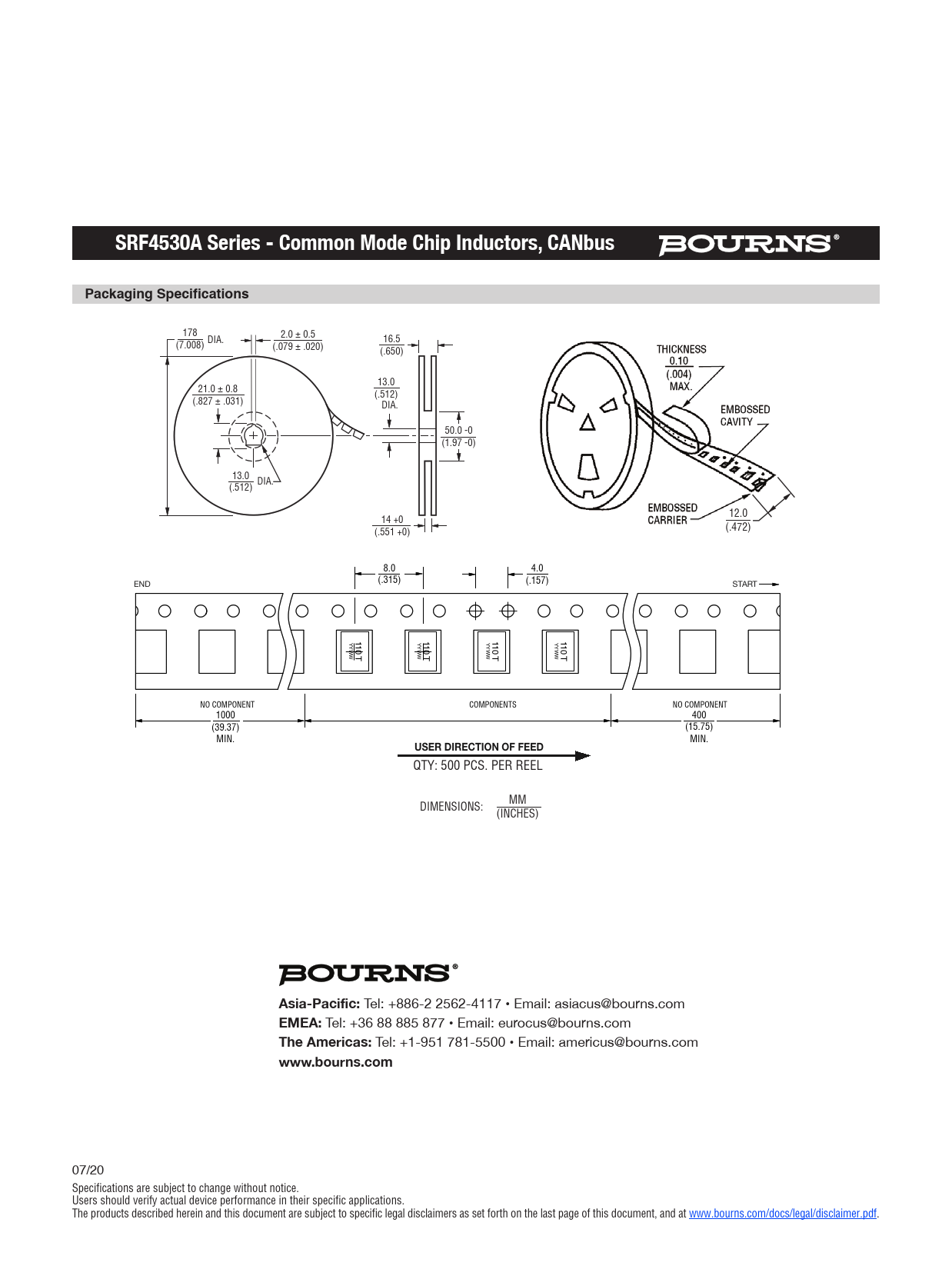 SRF4530A Series - Common Mode Chip Inductors, CANbusPackaging Specifications 178 2.0 ± 0.5 16.5 (7.008) DIA. (.079 ± .020) (.650) 13.0 21.0 ± 0.8 (.512) (.827 ± .031) DIA. 50.0 -0 (1.97 -0) 13.0 DIA. (.512) 12.0 14 +0 (.472) (.551 +0) 8.0 4.0 (.315) (.157) END START YYW 11 YYW 11 YYW 11 YYW 11 0 0 0 0 W T W T W T W T NO COMPONENT COMPONENTS NO COMPONENT 1000 400 (39.37) (15.75) MIN. MIN. USER DIRECTION OF FEED QTY: 500 PCS. PER REEL DIMENSIONS: MM (INCHES) Asia-Pacific: Tel: +886-2 2562-4117 • Email: asiacus@bourns.com EMEA: Tel: +36 88 885 877 • Email: eurocus@bourns.com The Americas: Tel: +1-951 781-5500 • Email: americus@bourns.com www.bourns.com 07/20 Specifications are subject to change without notice. Users should verify actual device performance in their specific applications. The products described herein and this document are subject to specific legal disclaimers as set forth on the last page of this document, and at www.bourns.com/docs/legal/disclaimer.pdf.
