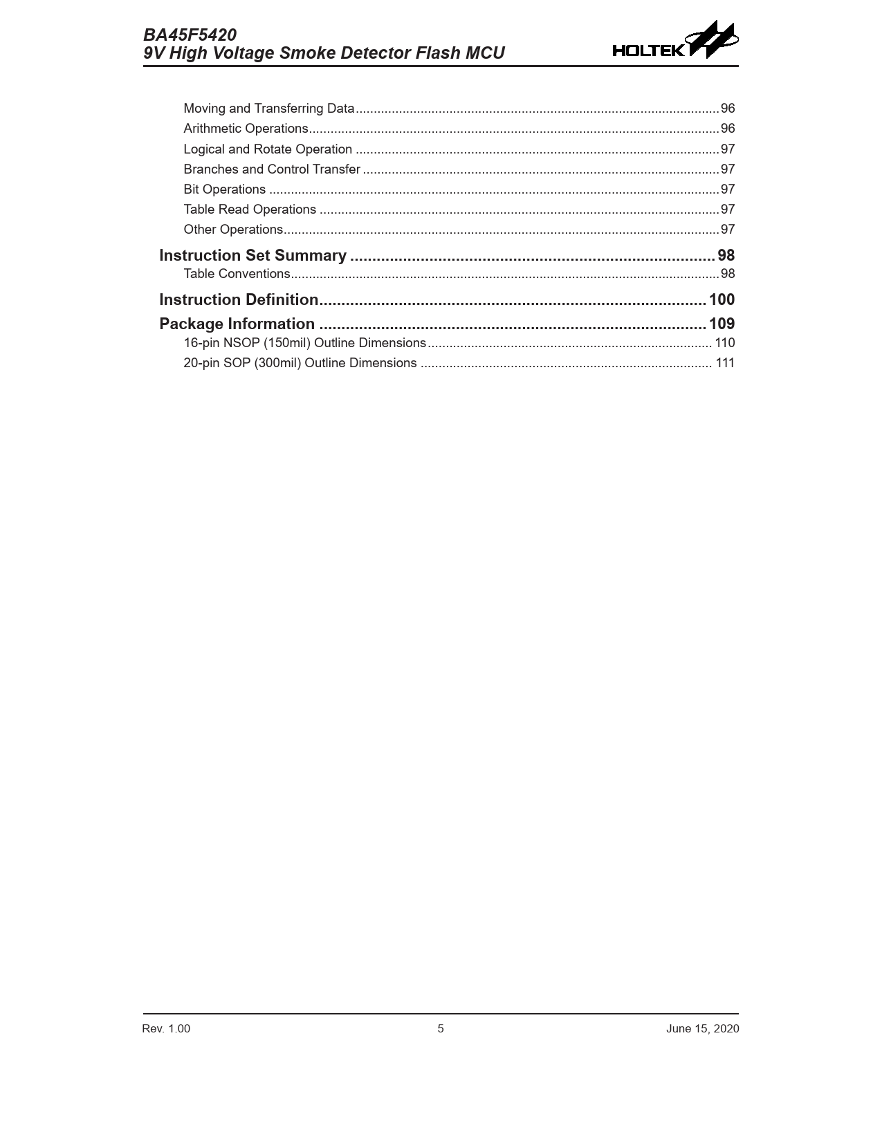 link to page 96 link to page 96 link to page 97 link to page 97 link to page 97 link to page 97 link to page 97 link to page 98 link to page 98 link to page 100 link to page 109 link to page 110 link to page 111 BA45F5420BA45F54209V High Voltage Smoke Detector Flash MCU9V High Voltage Smoke Detector Flash MCU Moving and Transferring Data ...96 Arithmetic Operations ..96 Logical and Rotate Operation ...97 Branches and Control Transfer ...97 Bit Operations ...97 Table Read Operations ...97 Other Operations ...97 Instruction Set Summary ...98 Table Conventions ...98 Instruction Definition ..100Package Information ..109 16-pin NSOP (150mil) Outline Dimensions ... 110 20-pin SOP (300mil) Outline Dimensions ... 111 Rev. 1.00 4 June 15, 2020 Rev. 1.00 5 June 15, 2020 Document Outline Features CPU Features Peripheral Features General Description Block Diagram Pin Assignment Pin Description Absolute Maximum Ratings D.C. Electrical Characteristics Operating Voltage Characteristics Standby Current Characteristics Operating Current Characteristics A.C. Electrical Characteristics High Speed Internal Oscillator – HIRC – Frequency Accuracy Low Speed Internal Oscillator Characteristics – LIRC System Start Up Time Characteristics Input/Output Characteristics Memory Characteristics Internal Reference Voltage Electrical Characteristics LVR Electrical Characteristics Sink Current Generator Electrical Characteristics Operational Amplifier Electrical Characteristics A/D Converter Electrical Characteristics LDO Electrical Characteristics Piezoelectric Horn Driver Characteristics Power-on Reset Characteristics System Architecture Clocking and Pipelining Program Counter Stack Arithmetic and Logic Unit – ALU Flash Program Memory Structure Special Vectors Look-up Table Table Program Example In Circuit Programming – ICP On-Chip Debug Support – OCDS RAM Data Memory Structure General Purpose Data Memory Special Purpose Data Memory Special Function Register Description Indirect Addressing Register – IAR0, IAR1 Memory Pointers – MP0, MP1 Accumulator – ACC Program Counter Low Register – PCL Look-up Table Registers – TBLP, TBLH Status Register – STATUS Emulated EEPROM Data Memory Emulated EEPROM Data Memory Structure Emulated EEPROM Registers Erasing the Emulated EEPROM Writing Data to the Emulated EEPROM Reading Data from the Emulated EEPROM Programming Considerations Oscillators Oscillator Overview System Clock Configurations Internal RC Oscillator – HIRC Internal 32kHz Oscillator – LIRC Operating Modes and System Clocks System Clocks System Operation Modes Control Registers Operating Mode Switching Standby Current Considerations Wake-up Watchdog Timer Watchdog Timer Clock Source Watchdog Timer Control Register Watchdog Timer Operation Reset and Initialisation Reset Functions Reset Initial Conditions Input/Output Ports Pull-high Resistors Port A Wake-up I/O Port Control Registers Sink Current Generator Pin-shared Functions I/O Pin Structures Programming Considerations Timer Modules – TM Introduction TM Operation TM Clock Source TM Interrupts TM External Pins Programming Considerations Periodic Type TM – PTM Periodic Type TM Operation Periodic Type TM Register Description Periodic Type TM Operating Modes Smoke Detector AFE Smoke Detector AFE Registers Operational Amplifier Operation Piezoel Horn Driver Analog to Digital Converter A/D Overview Registers Descriptions A/D Converter Reference Voltage A/D Converter Input Signals A/D Converter Operation Conversion Rate and Timing Diagram Summary of A/D Conversion Steps Programming Considerations A/D Transfer Function A/D Programming Examples Interrupts Interrupt Registers Interrupt Operation External Interrupt Timer Module Interrupts A/D Converter Interrupt Time Base Interrupts Interrupt Wake-up Function Programming Considerations Application Circuits External-driving Buzzer Application Circuit Self-driving Buzzer Application Circuit Instruction Set Introduction Instruction Timing Moving and Transferring Data Arithmetic Operations Logical and Rotate Operation Branches and Control Transfer Bit Operations Table Read Operations Other Operations Instruction Set Summary Table Conventions Instruction Definition Package Information 16-pin NSOP (150mil) Outline Dimensions 20-pin SOP (300mil) Outline Dimensions
