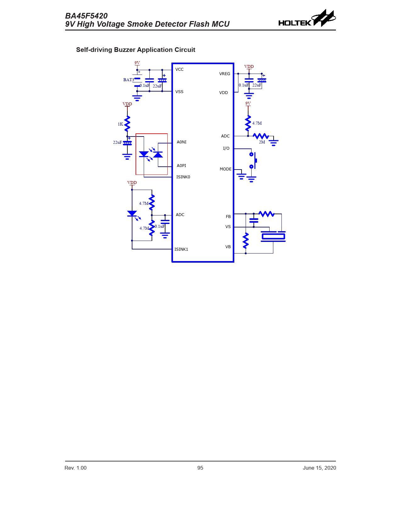 BA45F5420. 9V High Voltage Smoke Detector Flash MCU. Self-driving Buzzer Application Circuit