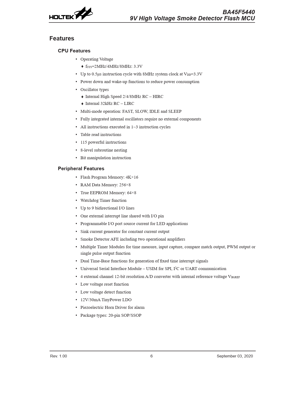 页数 / 页181 / 6 — BA45F5440. 9V High Voltage Smoke Detector Flash MCU. Features. CPU …