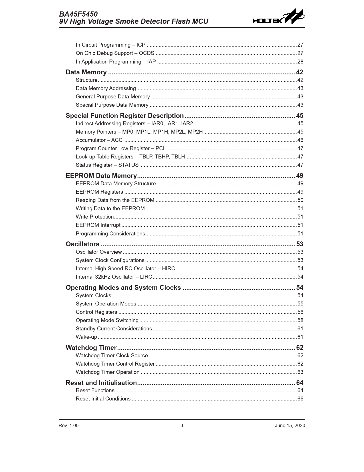 link to page 27 link to page 27 link to page 28 link to page 42 link to page 42 link to page 43 link to page 43 link to page 43 link to page 45 link to page 45 link to page 45 link to page 46 link to page 47 link to page 47 link to page 47 link to page 49 link to page 49 link to page 49 link to page 50 link to page 51 link to page 51 link to page 51 link to page 51 link to page 53 link to page 53 link to page 53 link to page 54 link to page 54 link to page 54 link to page 54 link to page 55 link to page 56 link to page 58 link to page 61 link to page 61 link to page 62 link to page 62 link to page 62 link to page 63 link to page 64 link to page 64 link to page 66 BA45F5450BA45F54509V High Voltage Smoke Detector Flash MCU9V High Voltage Smoke Detector Flash MCU In Circuit Programming – ICP ...27 On Chip Debug Support – OCDS ...27 In Application Programming – IAP ..28 Data Memory ...42 Structure ..42 Data Memory Addressing ..43 General Purpose Data Memory ..43 Special Purpose Data Memory ...43 Special Function Register Description ...45 Indirect Addressing Registers – IAR0, IAR1, IAR2 ...45 Memory Pointers – MP0, MP1L, MP1H, MP2L, MP2H ...45 Accumulator – ACC ..46 Program Counter Low Register – PCL ...47 Look-up Table Registers – TBLP, TBHP, TBLH ..47 Status Register – STATUS ...47 EEPROM Data Memory ...49 EEPROM Data Memory Structure ..49 EEPROM Registers ..49 Reading Data from the EEPROM ...50 Writing Data to the EEPROM ..51 Write Protection ...51 EEPROM Interrupt ..51 Programming Considerations ..51 Oscillators ...53 Oscillator Overview ...53 System Clock Configurations ..53 Internal High Speed RC Oscillator – HIRC ...54 Internal 32kHz Oscillator – LIRC ...54 Operating Modes and System Clocks ..54 System Clocks ..54 System Operation Modes ..55 Control Registers ..56 Operating Mode Switching ..58 Standby Current Considerations ...61 Wake-up ..61 Watchdog Timer ..62 Watchdog Timer Clock Source ..62 Watchdog Timer Control Register ...62 Watchdog Timer Operation ...63 Reset and Initialisation ...64 Reset Functions ..64 Reset Initial Conditions ...66 Rev. 1.00 2 June 15, 2020 Rev. 1.00 3 June 15, 2020 Document Outline Features CPU Features Peripheral Features General Description Block Diagram Pin Assignment Pin Description Absolute Maximum Ratings D.C. Characteristics Operating Voltage Characteristics Operating Current Characteristics Standby Current Characteristics A.C. Characteristics High Speed Internal Oscillator – HIRC – Frequency Accuracy Low Speed Internal Oscillator – LIRC System Start Up Time Characteristics Input/Output Characteristics Memory Characteristics LVD & LVR Electrical Characteristics A/D Converter Electrical Characteristics Reference Voltage Characteristics Sink Current Generator Electrical Characteristics Sink Current Generator Characteristic Curves Operational Amplifier Electrical Characteristics – Smoke Detector AFE 16-bit Voice D/A Converter Electrical Characteristics LDO Electrical Characteristics Piezoelectric Horn Driver Characteristics Power-on Reset Characteristics System Architecture Clocking and Pipelining Program Counter Stack Arithmetic and Logic Unit – ALU Flash Program Memory Structure Special Vectors Look-up Table Table Program Example In Circuit Programming – ICP On Chip Debug Support – OCDS In Application Programming – IAP Data Memory Structure Data Memory Addressing General Purpose Data Memory Special Purpose Data Memory Special Function Register Description Indirect Addressing Registers – IAR0, IAR1, IAR2 Memory Pointers – MP0, MP1L, MP1H, MP2L, MP2H Accumulator – ACC Program Counter Low Register – PCL Look-up Table Registers – TBLP, TBHP, TBLH Status Register – STATUS EEPROM Data Memory EEPROM Data Memory Structure EEPROM Registers Reading Data from the EEPROM Writing Data to the EEPROM Write Protection EEPROM Interrupt Programming Considerations Oscillators Oscillator Overview System Clock Configurations Internal High Speed RC Oscillator – HIRC Internal 32kHz Oscillator – LIRC Operating Modes and System Clocks System Clocks System Operation Modes Control Registers Operating Mode Switching Standby Current Considerations Wake-up Watchdog Timer Watchdog Timer Clock Source Watchdog Timer Control Register Watchdog Timer Operation Reset and Initialisation Reset Functions Reset Initial Conditions Input/Output Ports Pull-high Resistors Port A Wake-up I/O Port Control Registers I/O Port Source Current Control Pin-shared Functions I/O Pin Structures Programming Considerations Timer Modules – TM Introduction TM Operation TM Clock Source TM Interrupts TM External Pins Programming Considerations Standard Type TM – STM Standard TM Operation Standard Type TM Register Description Standard Type TM Operation Modes Periodic Type TM – PTM Periodic TM Operation Periodic Type TM Register Description Periodic Type TM Operating Modes Smoke Detector AFE Smoke Detector AFE Registers Operational Amplifier Operation Operational Amplifier Input Offset Calibration Piezoelectric Horn Driver Self-driving Mode External-driving Mode Analog to Digital Converter A/D Converter Overview A/D Converter Register Description A/D Converter Operation A/D Converter Reference Voltage A/D Converter Input Signals Conversion Rate and Timing Diagram Summary of A/D Conversion Steps Programming Considerations A/D Conversion Function A/D Conversion Programming Examples Sink Current Generator Sink Current Generator Registers 16-bit Voice D/A Converter D/A Converter Registers Serial Interface Module – SIM SPI Interface I2C Interface UART Interface UART External Pins UART Data Transfer Scheme UART Status and Control Registers Baud Rate Generator UART Setup and Control UART Transmitter UART Receiver Managing Receiver Errors UART Interrupt Structure UART Power Down and Wake-up Low Voltage Detector – LVD LVD Register LVD Operation Interrupts Interrupt Registers Interrupt Operation External Interrupts A/D Converter Interrupt Time Base Interrupts