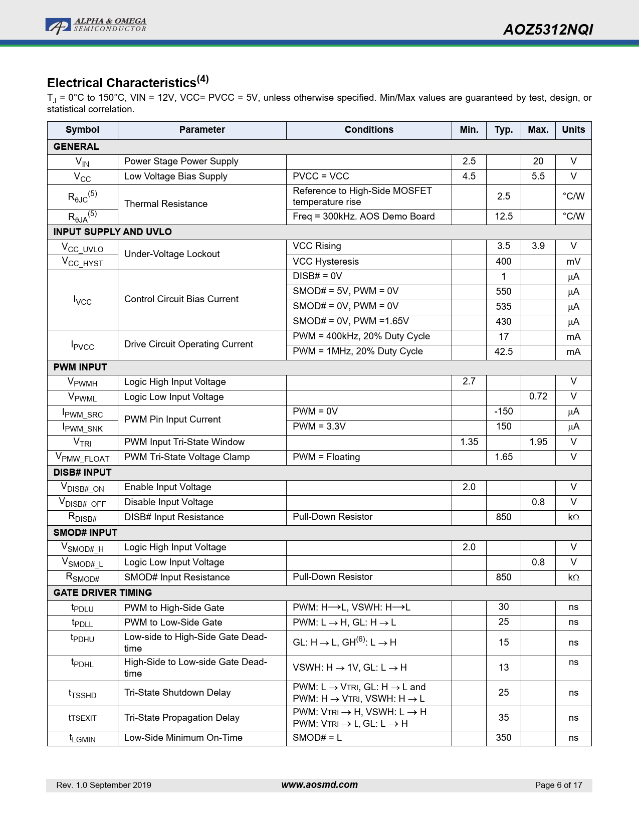 AOZ5312NQI. Electrical Characteristics(4). Symbol. Parameter. Conditions. Min. Typ. Max. Units. GENERAL. INPUT SUPPLY AND UVLO. PWM INPUT