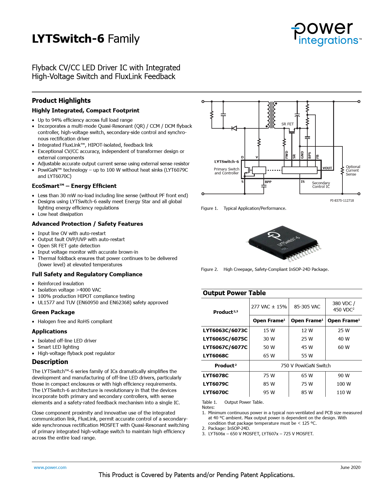 95 W 85 W 110 W incorporate both primary and secondary control ers, with sense elements and a safety-rated feedback mechanism into a single IC. Table 1. Output Power Table. Notes: Close component proximity and innovative use of the integrated 1. Minimum continuous power in a typical non-ventilated and PCB size measured communication link, FluxLink, permit accurate control of a secondary- at 40 °C ambient. Max output power is dependent on the design. With side synchronous rectification MOSFET with Quasi-Resonant switching condition that package temperature must be < 125 °C. of primary integrated high-voltage switch to maintain high efficiency 2. Package: InSOP-24D. 3. LYT606x ‒ 650 V MOSFET, LYT607x ‒ 725 V MOSFET. across the entire load range. www.power.com June 2020 This Product is Covered by Patents and/or Pending Patent Applications. Document Outline Product Highlights Description Output Power Table LYTSwitch-6 Functional Description Primary Controller Secondary Controller Absolute Maximum Ratings Thermal Resistance Key Electrical Characteristics Typical Performance Curves InSOP-24D Package Drawing MSL Table ESD and Latch-Up Table Part Ordering Information