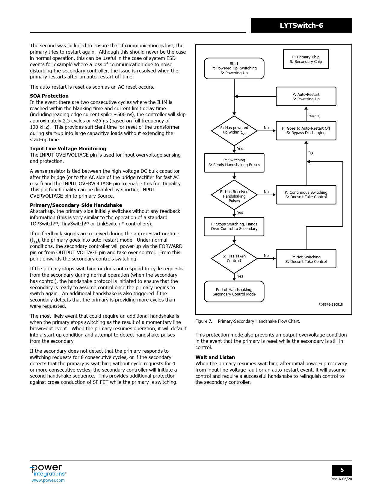 LYTSwitch-6 The second was included to ensure that if communication is lost, the primary tries to restart again. Although this should never be the case in normal operation, this can be useful in the case of system ESD P: Primary Chip events for example where a loss of communication due to noise S: Secondary Chip Start disturbing the secondary control er, the issue is resolved when the P: Powered Up, Switching S: Powering Up primary restarts after an auto-restart off time. The auto-restart is reset as soon as an AC reset occurs. SOA Protection P: Auto-Restart S: Powering Up In the event there are two consecutive cycles where the ILIM is reached within the blanking time and current limit delay time (including leading edge current spike ~500 ns), the control er will skip tAR(OFF) approximately 2.5 cycles or ~25 ms (based on full frequency of 100 kHz). This provides sufficient time for reset of the transformer S: Has powered No P: Goes to Auto-Restart Off during start-up into large capacitive loads without extending the up within tAR S: Bypass Discharging start-up time. Input Line Voltage Monitoring Yes The INPUT OVERVOLTAGE pin is used for input overvoltage sensing tAR and protection. P: Switching S: Sends Handshaking Pulses A sense resistor is tied between the high-voltage DC bulk capacitor after the bridge (or to the AC side of the bridge rectifier for fast AC reset) and the INPUT OVERVOLTAGE pin to enable this functionality. This pin functionality can be disabled by shorting INPUT P: Has Received No P: Continuous Switching OVERVOLTAGE pin to primary Source. Handshaking S: Doesn’t Take Control Pulses Primary/Secondary-Side Handshake At start-up, the primary-side initial y switches without any feedback Yes information (this is very similar to the operation of a standard TOPSwitch™, TinySwitch™ or LinkSwitch™ control ers). P: Stops Switching, Hands Over Control to Secondary If no feedback signals are received during the auto-restart on-time (t ), the primary goes into auto-restart mode. Under normal AR conditions, the secondary control er will power-up via the FORWARD pin or from OUTPUT VOLTAGE pin and take over control. From this S: Has Taken No point onwards the secondary controls switching. P: Not Switching Control? S: Doesn’t Take Control If the primary stops switching or does not respond to cycle requests from the secondary during normal operation (when the secondary Yes has control), the handshake protocol is initiated to ensure that the secondary is ready to assume control once the primary begins to End of Handshaking, switch again. An additional handshake is also triggered if the Secondary Control Mode secondary detects that the primary is providing more cycles than were requested. PI-8876-110818 The most likely event that could require an additional handshake is Figure 7. Primary-Secondary Handshake Flow Chart. when the primary stops switching as the result of a momentary line brown-out event. When the primary resumes operation, it will default into a start-up condition and attempt to detect handshake pulses This protection mode also prevents an output overvoltage condition from the secondary. in the event that the primary is reset while the secondary is still in control. If the secondary does not detect that the primary responds to switching requests for 8 consecutive cycles, or if the secondary Wait and Listen detects that the primary is switching without cycle requests for 4 When the primary resumes switching after initial power-up recovery or more consecutive cycles, the secondary control er will initiate a from input line voltage fault or an auto-restart event, it will assume second handshake sequence. This provides additional protection control and require a successful handshake to relinquish control to against cross-conduction of SF FET while the primary is switching. the secondary control er. 5 Rev. K 06/20 www.power.com Document Outline Product Highlights Description Output Power Table LYTSwitch-6 Functional Description Primary Controller Secondary Controller Absolute Maximum Ratings Thermal Resistance Key Electrical Characteristics Typical Performance Curves InSOP-24D Package Drawing MSL Table ESD and Latch-Up Table Part Ordering Information