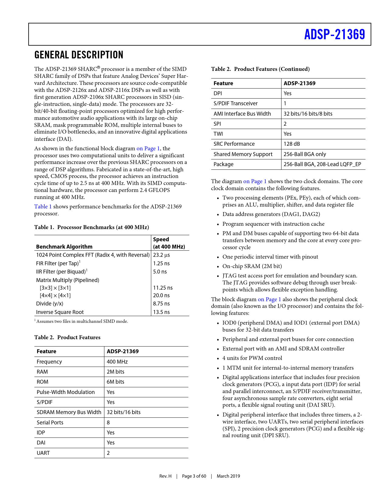 ADSP-21369. GENERAL DESCRIPTION. Table 2. Product Features (Continued). Feature. Table 1. Processor Benchmarks (at 400 MHz)