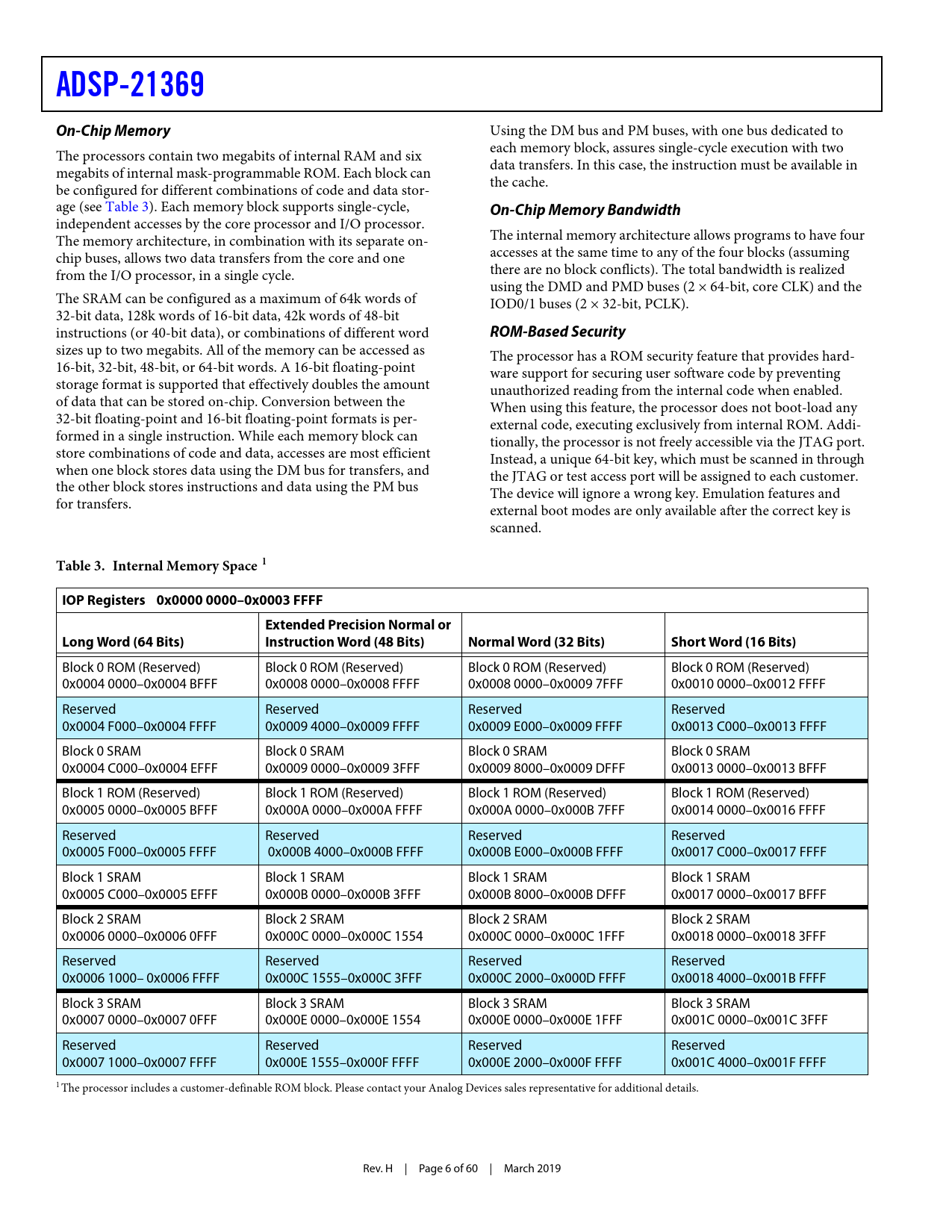 ADSP-21369. On-Chip Memory. On-Chip Memory Bandwidth. ROM-Based Security. Table 3. Internal Memory Space 1