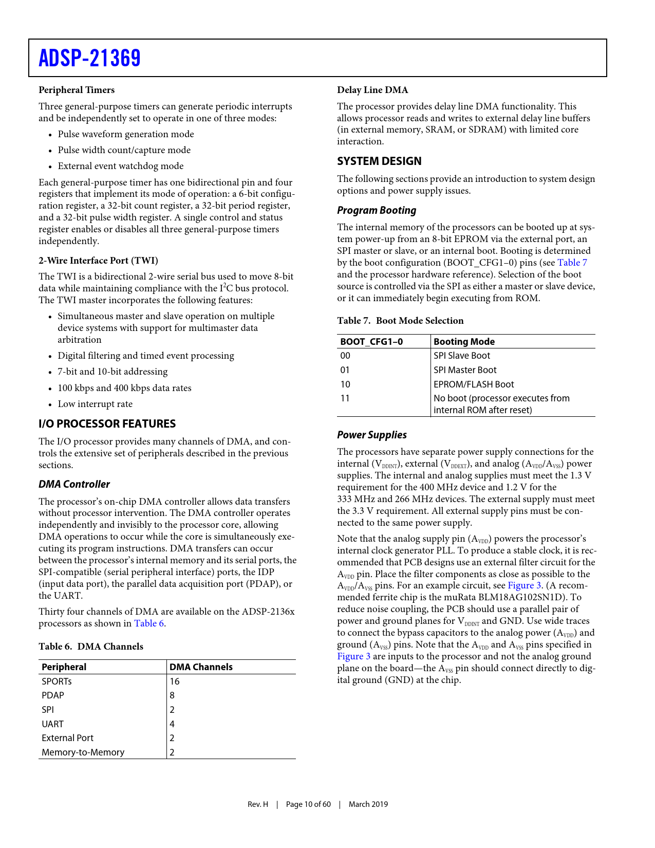link to page 10 link to page 10 link to page 11 link to page 11 ADSP-21369Peripheral TimersDelay Line DMA Three general-purpose timers can generate periodic interrupts The processor provides delay line DMA functionality. This and be independently set to operate in one of three modes: allows processor reads and writes to external delay line buffers • Pulse waveform generation mode (in external memory, SRAM, or SDRAM) with limited core interaction. • Pulse width count/capture mode • External event watchdog mode SYSTEM DESIGN Each general-purpose timer has one bidirectional pin and four The following sections provide an introduction to system design registers that implement its mode of operation: a 6-bit configu- options and power supply issues. ration register, a 32-bit count register, a 32-bit period register, Program Booting and a 32-bit pulse width register. A single control and status register enables or disables all three general-purpose timers The internal memory of the processors can be booted up at sys- independently. tem power-up from an 8-bit EPROM via the external port, an SPI master or slave, or an internal boot. Booting is determined 2-Wire Interface Port (TWI) by the boot configuration (BOOT_CFG1–0) pins (see Table 7 The TWI is a bidirectional 2-wire serial bus used to move 8-bit and the processor hardware reference). Selection of the boot data while maintaining compliance with the I2C bus protocol. source is controlled via the SPI as either a master or slave device, The TWI master incorporates the following features: or it can immediately begin executing from ROM. • Simultaneous master and slave operation on multiple Table 7. Boot Mode Selection device systems with support for multimaster data arbitration BOOT_CFG1–0Booting Mode • Digital filtering and timed event processing 00 SPI Slave Boot • 7-bit and 10-bit addressing 01 SPI Master Boot • 100 kbps and 400 kbps data rates 10 EPROM/FLASH Boot 11 No boot (processor executes from • Low interrupt rate internal ROM after reset) I/O PROCESSOR FEATURESPower Supplies The I/O processor provides many channels of DMA, and con- trols the extensive set of peripherals described in the previous The processors have separate power supply connections for the sections. internal (V ), external (V ), and analog (A /A ) power DDINT DDEXT VDD VSS supplies. The internal and analog supplies must meet the 1.3 V DMA Controller requirement for the 400 MHz device and 1.2 V for the The processor’s on-chip DMA controller allows data transfers 333 MHz and 266 MHz devices. The external supply must meet without processor intervention. The DMA controller operates the 3.3 V requirement. All external supply pins must be con- independently and invisibly to the processor core, allowing nected to the same power supply. DMA operations to occur while the core is simultaneously exe- Note that the analog supply pin (A ) powers the processor’s VDD cuting its program instructions. DMA transfers can occur internal clock generator PLL. To produce a stable clock, it is rec- between the processor’s internal memory and its serial ports, the ommended that PCB designs use an external filter circuit for the SPI-compatible (serial peripheral interface) ports, the IDP A pin. Place the filter components as close as possible to the VDD (input data port), the parallel data acquisition port (PDAP), or A /A pins. For an example circuit, see Figure 3. (A recom- VDD VSS the UART. mended ferrite chip is the muRata BLM18AG102SN1D). To Thirty four channels of DMA are available on the ADSP-2136x reduce noise coupling, the PCB should use a parallel pair of processors as shown in Table 6. power and ground planes for V and GND. Use wide traces DDINT to connect the bypass capacitors to the analog power (A ) and VDD Table 6. DMA Channels ground (A ) pins. Note that the A and A pins specified in VSS VDD VSS Figure 3 are inputs to the processor and not the analog ground PeripheralDMA Channels plane on the board—the A pin should connect directly to dig- VSS SPORTs 16 ital ground (GND) at the chip. PDAP 8 SPI 2 UART 4 External Port 2 Memory-to-Memory 2 Rev. H | Page 10 of 60 | March 2019 Document Outline Summary Dedicated Audio Components Table of Contents Revision History General Description SHARC Family Core Architecture SIMD Computational Engine Independent, Parallel Computation Units Data Register File Context Switch Universal Registers Timer Single-Cycle Fetch of Instruction and Four Operands Instruction Cache Data Address Generators with Zero-Overhead Hardware Circular Buffer Support Flexible Instruction Set On-Chip Memory On-Chip Memory Bandwidth ROM-Based Security Family Peripheral Architecture External Port SDRAM Controller External Memory Shared External Memory External Port Throughput Asynchronous Memory Controller Pulse-Width Modulation Digital Applications Interface (DAI) Serial Ports S/PDIF-Compatible Digital Audio Receiver/Transmitter Synchronous/Asynchronous Sample Rate Converter Input Data Port Precision Clock Generators Digital Peripheral Interface (DPI) Serial Peripheral (Compatible) Interface UART Port Peripheral Timers 2-Wire Interface Port (TWI) I/O Processor Features DMA Controller Delay Line DMA System Design Program Booting Power Supplies Target Board JTAG Emulator Connector Development Tools Integrated Development Environments (IDEs) EZ-KIT Lite Evaluation Board EZ-KIT Lite Evaluation Kits Software Add-Ins for CrossCore Embedded Studio Board Support Packages for Evaluation Hardware Middleware Packages Algorithmic Modules Designing an Emulator-Compatible DSP Board (Target) Additional Information Related Signal Chains Pin Function Descriptions Specifications Operating Conditions Electrical Characteristics ESD Caution Maximum Power Dissipation Absolute Maximum Ratings Timing Specifications Core Clock Requirements Voltage Controlled Oscillator Power-Up Sequencing Clock Input Clock Signals Reset Interrupts Core Timer Timer PWM_OUT Cycle Timing Time