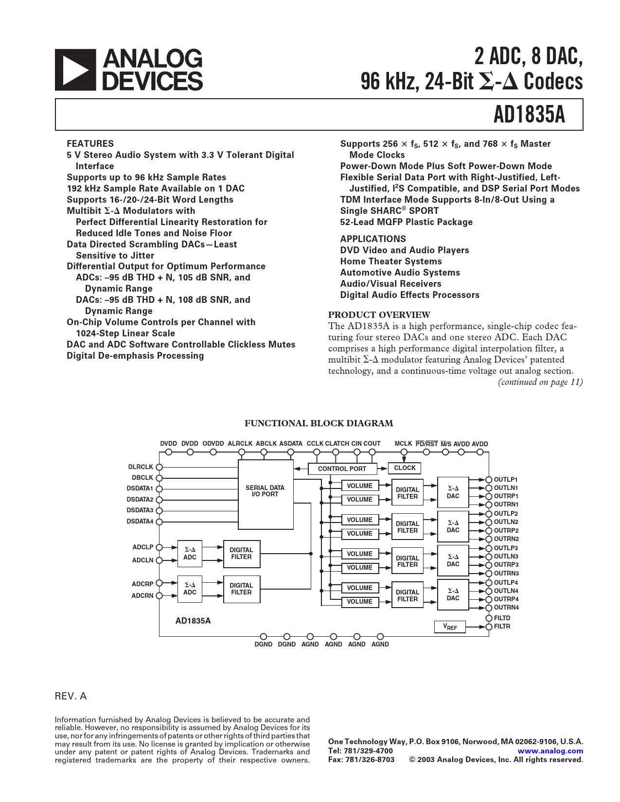 FUNCTIONAL BLOCK DIAGRAM DVDD DVDD ODVDD ALRCLK ABCLK ASDATA CCLK CLATCH CIN COUT MCLK PD/RST M/S AVDD AVDD DLRCLK CONTROL PORT CLOCK DBCLK OUTLP1 DSDATA1 SERIAL DATA VOLUME OUTLN1 DIGITAL - I/O PORT FILTER DAC OUTRP1 DSDATA2 VOLUME OUTRN1 DSDATA3 OUTLP2 DSDATA4 VOLUME DIGITAL - OUTLN2 FILTER DAC OUTRP2 VOLUME OUTRN2 ADCLP - DIGITAL OUTLP3 VOLUME ADC FILTER - OUTLN3 ADCLN DIGITAL FILTER DAC VOLUME OUTRP3 OUTRN3 ADCRP - OUTLP4 DIGITAL VOLUME ADC FILTER DIGITAL - OUTLN4 ADCRN FILTER DAC VOLUME OUTRP4 OUTRN4 FILTD AD1835A V FILTR REF DGND DGND AGND AGND AGND AGND