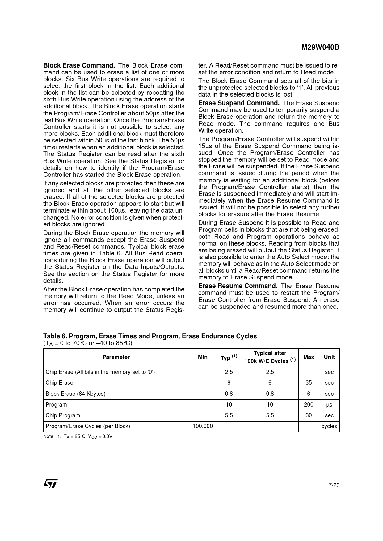 M29W040BBlock Erase Command. The Block Erase com- ter. A Read/Reset command must be issued to re- mand can be used to erase a list of one or more set the error condition and return to Read mode. blocks. Six Bus Write operations are required to The Block Erase Command sets all of the bits in select the first block in the list. Each additional the unprotected selected blocks to ‘1’. All previous block in the list can be selected by repeating the data in the selected blocks is lost. sixth Bus Write operation using the address of the Erase Suspend Command. The Erase Suspend additional block. The Block Erase operation starts Command may be used to temporarily suspend a the Program/Erase Controller about 50µs after the Block Erase operation and return the memory to last Bus Write operation. Once the Program/Erase Read mode. The command requires one Bus Controller starts it is not possible to select any Write operation. more blocks. Each additional block must therefore be selected within 50µs of the last block. The 50µs The Program/Erase Controller will suspend within timer restarts when an additional block is selected. 15µs of the Erase Suspend Command being is- The Status Register can be read after the sixth sued. Once the Program/Erase Controller has Bus Write operation. See the Status Register for stopped the memory will be set to Read mode and details on how to identify if the Program/Erase the Erase will be suspended. If the Erase Suspend Controller has started the Block Erase operation. command is issued during the period when the memory is waiting for an additional block (before If any selected blocks are protected then these are the Program/Erase Controller starts) then the ignored and all the other selected blocks are Erase is suspended immediately and will start im- erased. If all of the selected blocks are protected mediately when the Erase Resume Command is the Block Erase operation appears to start but will issued. It will not be possible to select any further terminate within about 100µs, leaving the data un- blocks for erasure after the Erase Resume. changed. No error condition is given when protect- ed blocks are ignored. During Erase Suspend it is possible to Read and Program cells in blocks that are not being erased; During the Block Erase operation the memory will both Read and Program operations behave as ignore all commands except the Erase Suspend normal on these blocks. Reading from blocks that and Read/Reset commands. Typical block erase are being erased will output the Status Register. It times are given in Table 6. All Bus Read opera- is also possible to enter the Auto Select mode: the tions during the Block Erase operation will output memory will behave as in the Auto Select mode on the Status Register on the Data Inputs/Outputs. all blocks until a Read/Reset command returns the See the section on the Status Register for more memory to Erase Suspend mode. details. Erase Resume Command. The Erase Resume After the Block Erase operation has completed the command must be used to restart the Program/ memory will return to the Read Mode, unless an Erase Controller from Erase Suspend. An erase error has occurred. When an error occurs the can be suspended and resumed more than once. memory will continue to output the Status Regis- Table 6. Program, Erase Times and Program, Erase Endurance Cycles (TA = 0 to 70°C or –40 to 85°C) Typical afterParameterMinTyp (1)100k W/E Cycles (1)MaxUnit Chip Erase (All bits in the memory set to ‘0’) 2.5 2.5 sec Chip Erase 6 6 35 sec Block Erase (64 Kbytes) 0.8 0.8 6 sec Program 10 10 200 µs Chip Program 5.5 5.5 30 sec Program/Erase Cycles (per Block) 100,000 cycles Note: 1. TA = 25°C, VCC = 3.3V. 7/20 Document Outline Table 1. Signal Names Table 2. Absolute Maximum Ratings (1) Table 3. Uniform Block Addresses, M29W040B Table 4. Bus Operations Table 5. Commands Read/Reset. Auto Select. Program, Unlock Bypass Program, Chip Erase, Block Erase. Unlock Bypass. Unlock Bypass Reset. Erase Suspend. Erase Resume. Table 6. Program, Erase Times and Program, Erase Endurance Cycles (TA = 0 to 70˚C or –40 to 85˚C) Table 7. Status Register Bits Table 8. AC Measurement Conditions Table 9. Capacitance (TA = 25 ˚C, f = 1 MHz) Table 10. DC Characteristics (TA = 0 to 70˚C or –40 to 85˚C) Table 11. Read AC Characteristics (TA = 0 to 70˚C or –40 to 85˚C) Table 12. Write AC Characteristics, Write Enable Controlled (TA = 0 to 70˚C or –40 to 85˚C) Table 13. Write AC Characteristics, Chip Enable Controlled (TA = 0 to 70˚C or –40 to 85˚C) Table 14. Ordering Information Scheme Table 15. PLCC32 – 32 lead Plastic Leaded Chip Carrier, Package Mechanical Data Table 16. TSOP32 – 32 lead Plastic Thin Small Outline, 8 x 20mm, Package Mechanical Data Table 17. TSOP32 – 32 lead Plastic Thin Small Outline, 8 x 14mm, Package Mechanical Data Table 18. Revision History SUMMARY DESCRIPTION SIGNAL DESCRIPTIONS Address Inputs (A0-A18). Data Inputs/Outputs (DQ0-DQ7). Chip Enable (E). Output Enable (G). Write Enable (W). VCC Supply Voltage. VSS Ground. BUS OPERATIONS Bus Read. Bus Write. Output Disable. Standby. Automatic Standby. Special Bus Operations Electronic Signature. Block Protection and Blocks Unprotection. COMMAND INTERFACE Read/Reset Command. Auto Select Command. Program Command. Unlock Bypass Command. Unlock Bypass Program Command. Unlock Bypass Reset Command. Chip Erase Command. Block Erase Command. Erase Suspend Command. Erase Resume Command. STATUS REGISTER Data Polling Bit (DQ7). Toggle Bit (DQ6). Error Bit (DQ5). Erase Timer Bit (DQ3). Alternative Toggle Bit (DQ2). Figure 1. Logic Diagram Figure 2. PLCC Connections Figure 3. TSOP Connections Figure 4. Data Polling Flowchart Figure 5. Data Toggle Flowchart Figure 6. AC Testing Input Output Waveform Figure 7. AC Testing Load Circuit Figure 8. Read Mode AC Waveforms Figure 9. Write AC Waveforms, Write Enable Controlled Figure 10. Write AC Waveforms, Chip Enable Controlled Figure 