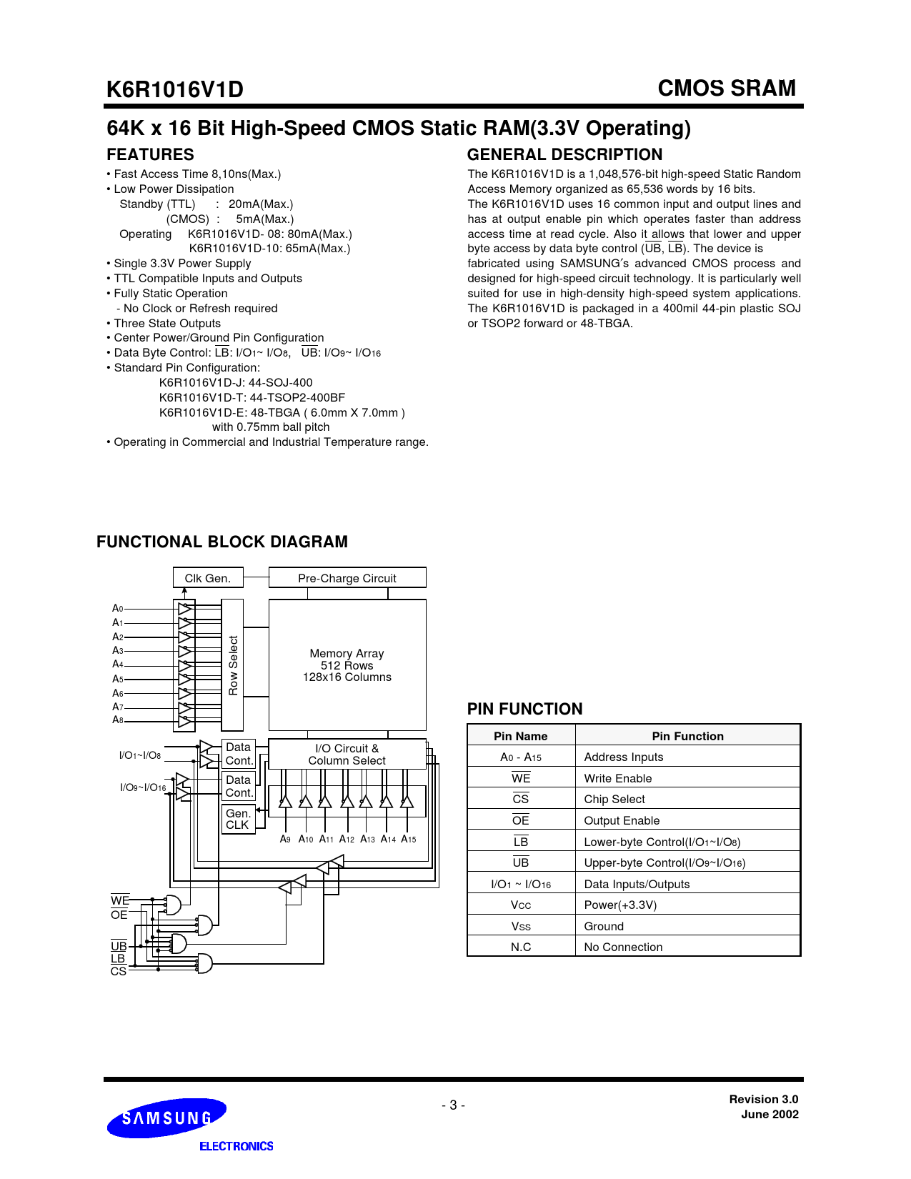 for AT&T. K6R1016V1D. CMOS SRAM. 64K x 16 Bit High-Speed CMOS Static RAM(3.3V Operating) FEATURES. GENERAL DESCRIPTION