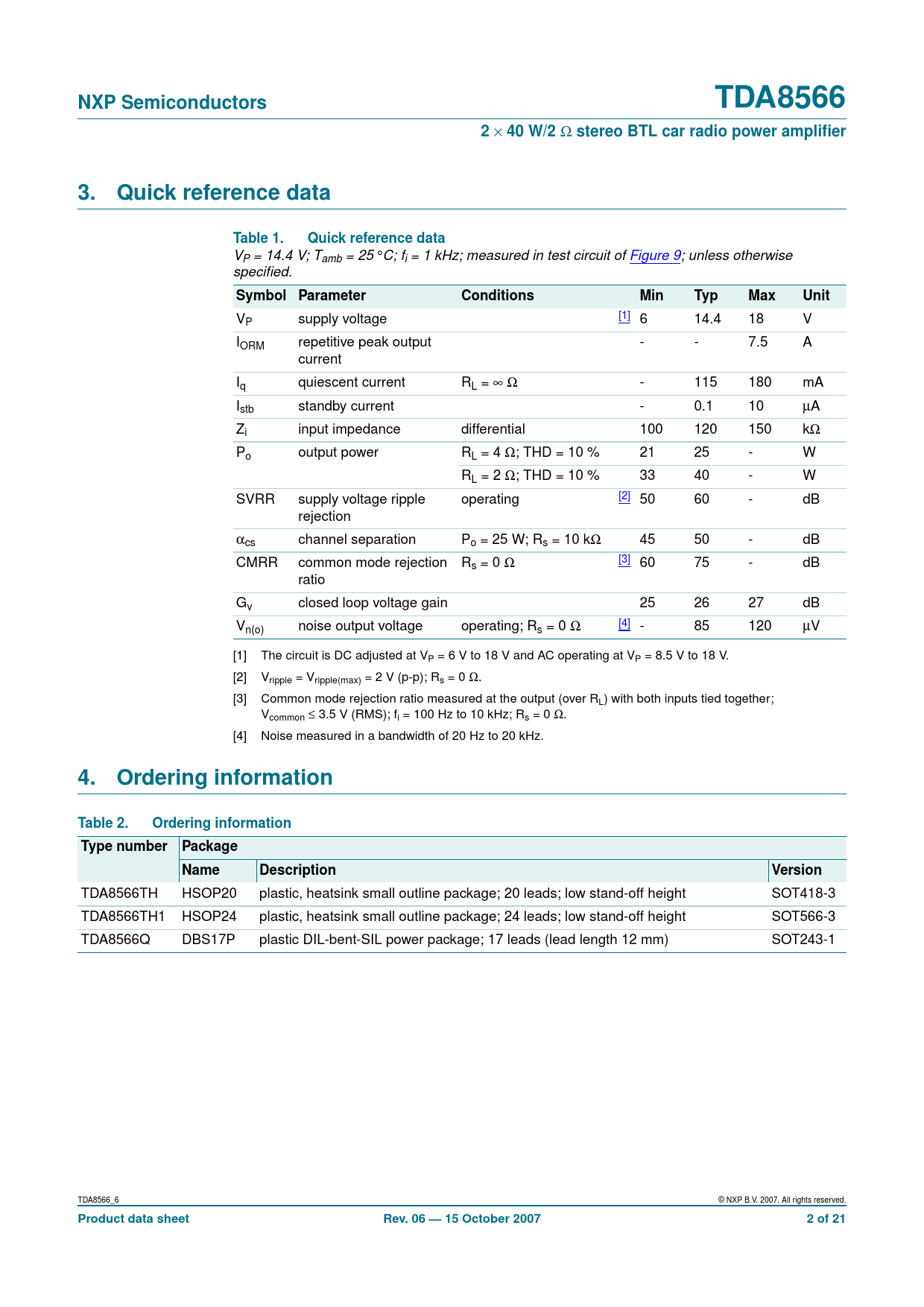 NXP Semiconductors. TDA8566. 40 W/2. stereo BTL car radio power amplifier. Quick reference data. Table 1. Symbol Parameter