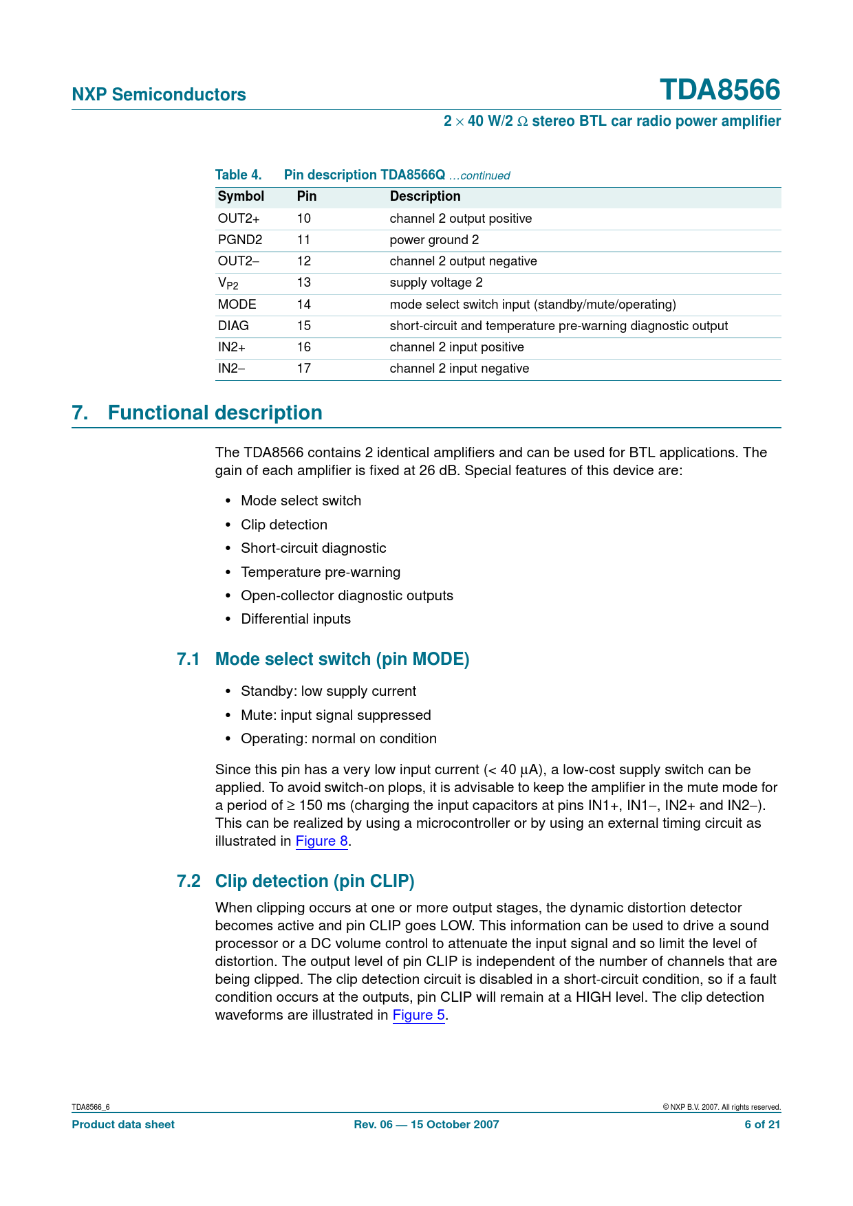 NXP Semiconductors. TDA8566. 40 W/2. stereo BTL car radio power amplifier. Table 4. Pin description TDA8566Q. Symbol. Pin. Description