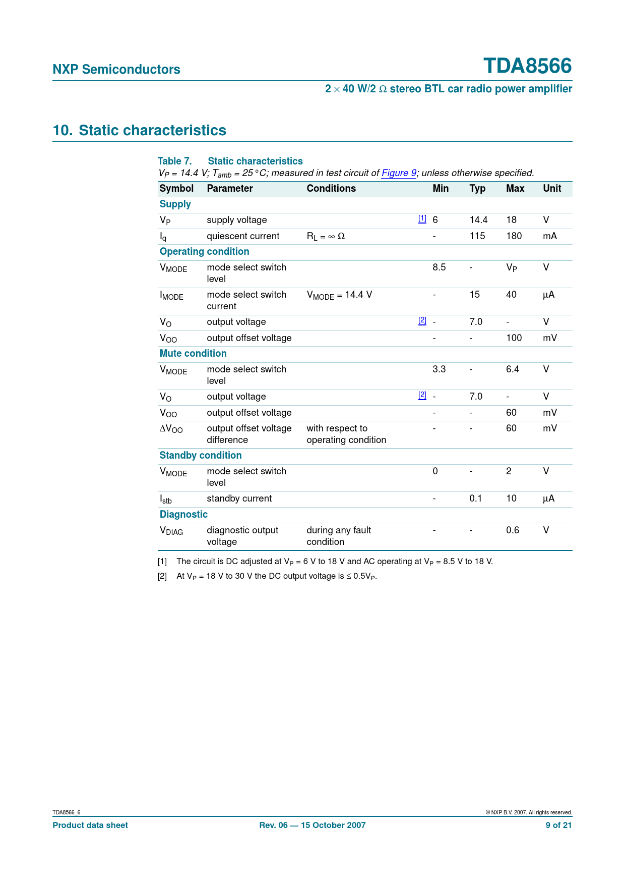NXP Semiconductors. TDA8566. 40 W/2. stereo BTL car radio power amplifier. 10. Static characteristics. Table 7