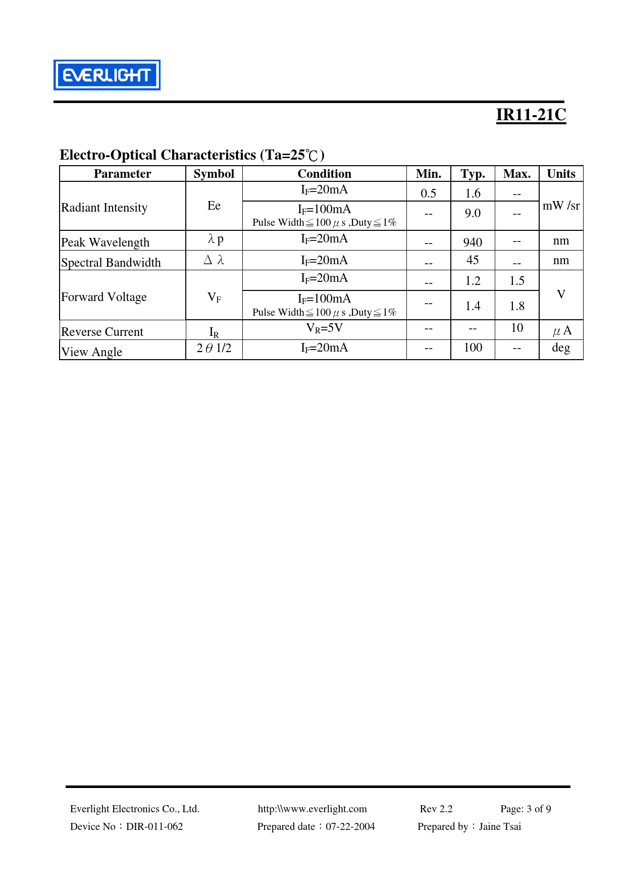 IF=20mA 0.5 1.6 -- Radiant Intensity Ee I mW /sr F=100mA -- 9.0 -- Pulse Width≦100μs ,Duty≦1% Peak Wavelength λp IF=20mA -- 940 -- nm Spectral Bandwidth Δλ IF=20mA -- 45 -- nm IF=20mA -- 1.2 1.5 Forward Voltage V V F IF=100mA -- 1.4 1.8 Pulse Width≦100μs ,Duty≦1% Reverse Current IR VR=5V -- -- 10 μA View Angle 2θ1/2 IF=20mA -- 100 -- deg Everlight Electronics Co., Ltd. http:\\www.everlight.com Rev 2.2 Page: 3 of 9 Device No:DIR-011-062 Prepared date:07-22-2004 Prepared by:Jaine Tsai