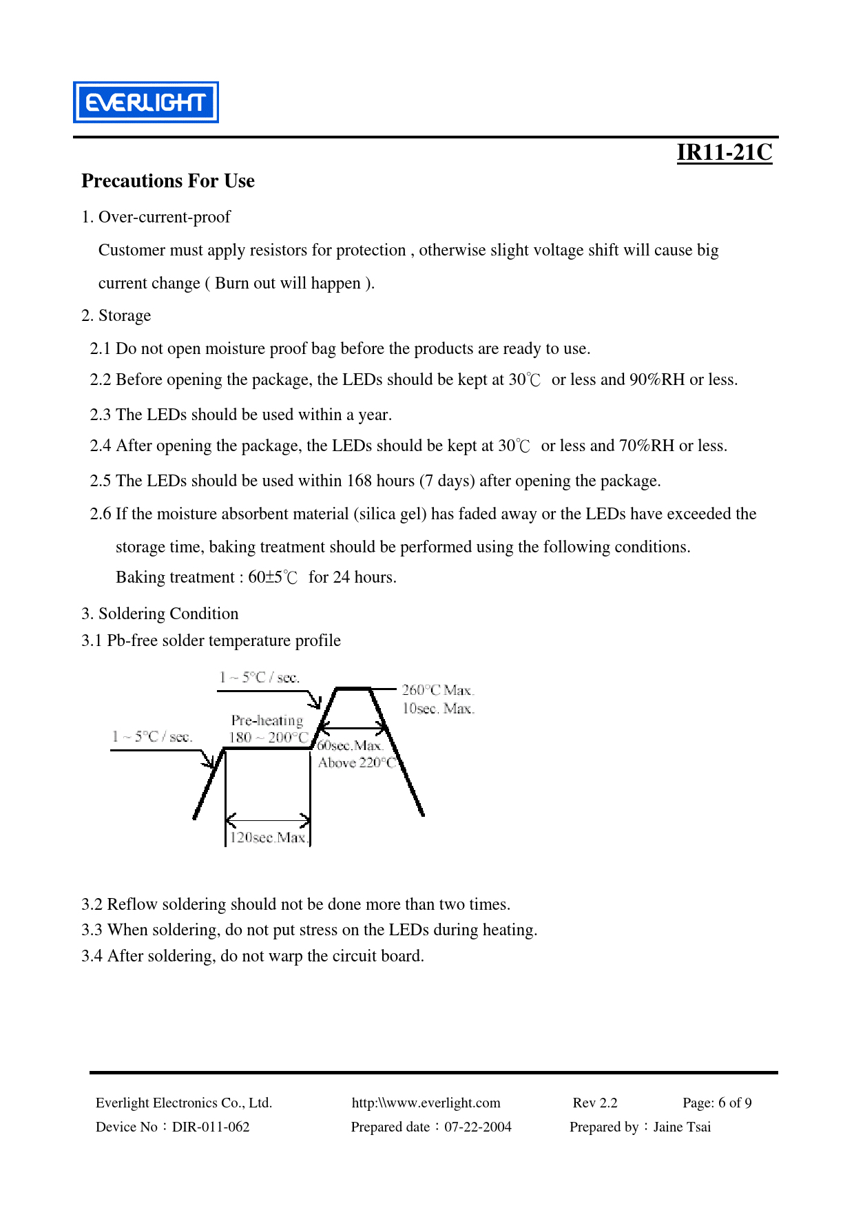 1. Over-current-proof Customer must apply resistors for protection , otherwise slight voltage shift will cause big current change ( Burn out will happen ). 2. Storage 2.1 Do not open moisture proof bag before the products are ready to use. 2.2 Before opening the package, the LEDs should be kept at 30℃ or less and 90%RH or less. 2.3 The LEDs should be used within a year. 2.4 After opening the package, the LEDs should be kept at 30℃ or less and 70%RH or less. 2.5 The LEDs should be used within 168 hours (7 days) after opening the package. 2.6 If the moisture absorbent material (silica gel) has faded away or the LEDs have exceeded the storage time, baking treatment should be performed using the following conditions. Baking treatment : 60±5℃ for 24 hours. 3. Soldering Condition 3.1 Pb-free solder temperature profile 3.2 Reflow soldering should not be done more than two times. 3.3 When soldering, do not put stress on the LEDs during heating. 3.4 After soldering, do not warp the circuit board. Everlight Electronics Co., Ltd. http:\\www.everlight.com Rev 2.2 Page: 6 of 9 Device No:DIR-011-062 Prepared date:07-22-2004 Prepared by:Jaine Tsai