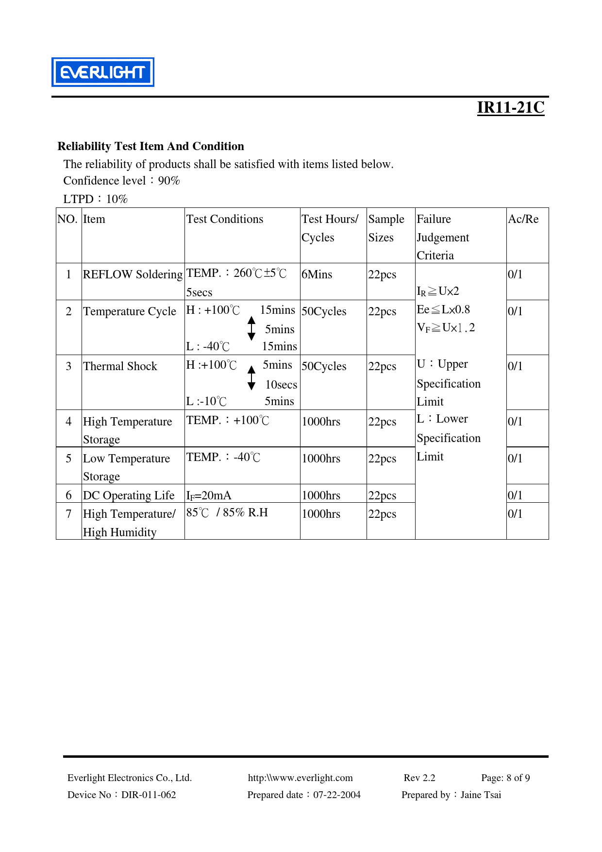 IR11-21C. Reliability Test Item And Condition