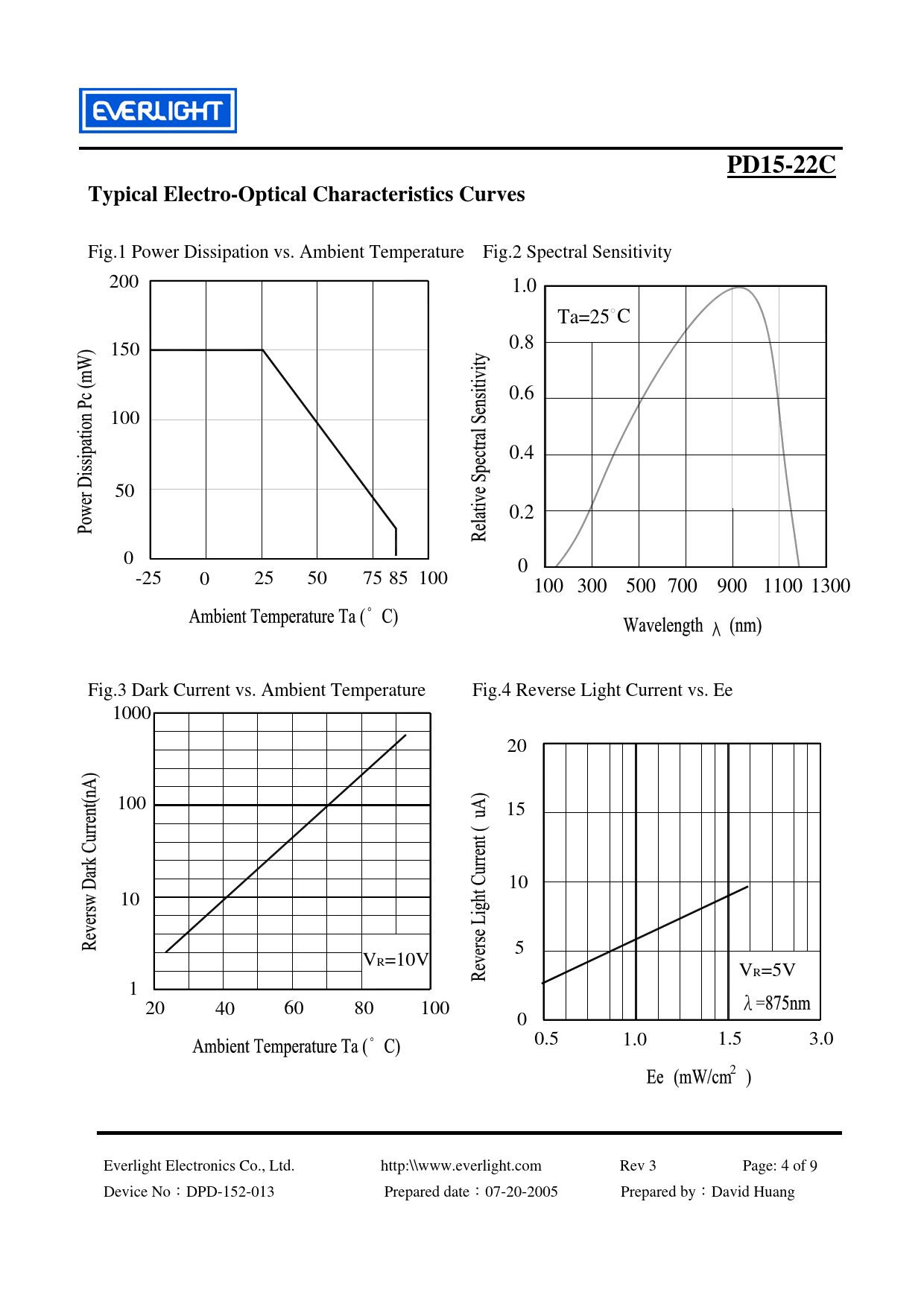 Fig.1 Power Dissipation vs. Ambient Temperature Fig.2 Spectral Sensitivity 200 1.0 Ta=25 C 150 0.8 0.6 100 0.4 50 0.2 0 0 -25 0 25 50 75 85 100 100 300 500 700 900 1100 1300 Fig.3 Dark Current vs. Ambient Temperature Fig.4 Reverse Light Current vs. Ee 1000 20 100 15 10 10 5 VR=10V VR=5V 1 20 40 60 80 100 0 0.5 1.0 1.5 3.0 2 Everlight Electronics Co., Ltd. http:\\www.everlight.com Rev 3 Page: 4 of 9 Device No:DPD-152-013 Prepared date:07-20-2005 Prepared by:David Huang