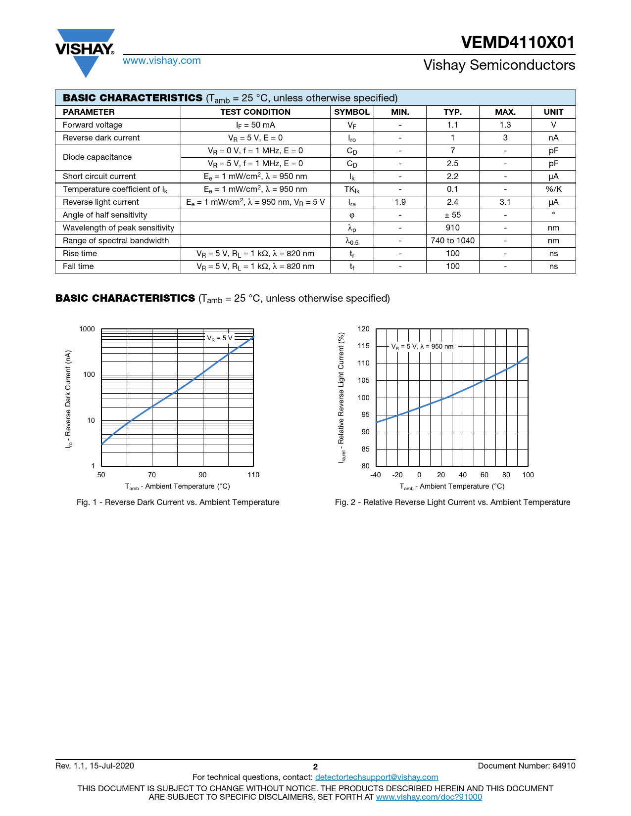 VEMD4110X01 www.vishay.com Vishay Semiconductors BASIC CHARACTERISTICS (Tamb = 25 °C, unless otherwise specified) PARAMETERTEST CONDITIONSYMBOLMIN.TYP.MAX.UNIT Forward voltage IF = 50 mA VF - 1.1 1.3 V Reverse dark current VR = 5 V, E = 0 Iro - 1 3 nA VR = 0 V, f = 1 MHz, E = 0 CD - 7 - pF Diode capacitance VR = 5 V, f = 1 MHz, E = 0 CD - 2.5 - pF Short circuit current Ee = 1 mW/cm2, λ = 950 nm Ik - 2.2 - μA Temperature coefficient of Ik Ee = 1 mW/cm2, λ = 950 nm TKIk - 0.1 - %/K Reverse light current Ee = 1 mW/cm2, λ = 950 nm, VR = 5 V Ira 1.9 2.4 3.1 μA Angle of half sensitivity ϕ - ± 55 - ° Wavelength of peak sensitivity λp - 910 - nm Range of spectral bandwidth λ0.5 - 740 to 1040 - nm Rise time VR = 5 V, RL = 1 kΩ, λ = 820 nm tr - 100 - ns Fall time VR = 5 V, RL = 1 kΩ, λ = 820 nm tf - 100 - ns BASIC CHARACTERISTICS (Tamb = 25 °C, unless otherwise specified) Axis Title Axis Title 1000 10000 120 10000 ) V = 5 V R (% 115 V = 5 V, λ = 950 nm ) R rrent (nA u 110 C 100 1000 1000 rrent u ght 105 Li C ne ne ne ine ine ne rk a 100 1st li 2nd li verse 1st li 2nd l 2nd l e 2nd li R 95 10 100 100 everse D R 90 - I ro - Relative l 85 ,re I ra 1 10 80 10 50 70 90 110 -40 -20 0 20 40 60 80 100 T - Ambient Temperature (°C) T - Ambient Temperature (°C) amb amb Fig. 1 - Reverse Dark Current vs. Ambient Temperature Fig. 2 - Relative Reverse Light Current vs. Ambient Temperature Rev. 1.1, 15-Jul-2020 2 Document Number: 84910 For technical questions, contact: detectortechsupport@vishay.com THIS DOCUMENT IS SUBJECT TO CHANGE WITHOUT NOTICE. THE PRODUCTS DESCRIBED HEREIN AND THIS DOCUMENT ARE SUBJECT TO SPECIFIC DISCLAIMERS, SET FORTH AT www.vishay.com/doc?91000