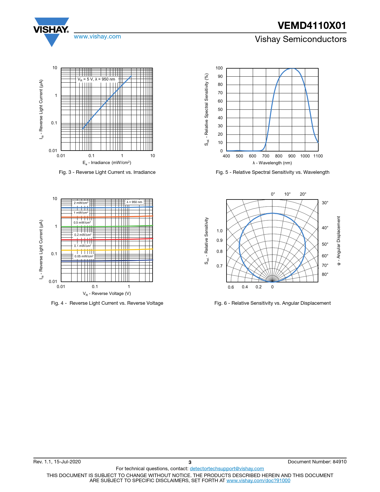 VEMD4110X01 www.vishay.com Vishay Semiconductors Axis Title Axis Title 10 10000 100 10000 ) 90 ) V = 5 V, λ = 950 nm R (% (μA ity 80 tiv 70 1 1000 nsi rrent 1000 e u S 60 ine ne ne ine ne ne ght C 50 ectral 1st li 2nd l 2nd li p 1st li 2nd l 2nd li 40 0.1 100 100 everse Li 30 ative S R el - R 20 I ra - l.re 10 S 0.01 10 0 10 0.01 0.1 1 10 400 500 600 700 800 900 1000 1100 E - Irradiance (mW/cm2) e λ - Wavelength (nm) Fig. 3 - Reverse Light Current vs. Irradiance Fig. 5 - Relative Spectral Sensitivity vs. Wavelength Axis Title Axis Tit 0° le 10° 20° 10 10000 10000 2 mW/cm2 λ = 950 nm 30° 1 mW/cm2 ) ent 0.5 mW/cm2 (μA 1 1000 itivity s 1000 40° 1.0 0.2 mW/cm2 ne ne ine Sen isplacem ne 0.9 tive 50° 0.1 mW/cm2 1st li ine 2nd li 2nd l 2nd li ght Current ela 0.8 0.1 100 R gular D 2nd l - 100 n 0.05 mW/cm2 60° l. A re - S φ everse Li 0.7 70° R - 80° I ra 0.01 10 10 0.01 0.1 1 0.6 0.4 0.2 0 V - Reverse Voltage (V) R 1st line Fig. 4 - Reverse Light Current vs. Reverse Voltage Fig. 6 - Relative Sensitivity vs. Angular Displacement Rev. 1.1, 15-Jul-2020 3 Document Number: 84910 For technical questions, contact: detectortechsupport@vishay.com THIS DOCUMENT IS SUBJECT TO CHANGE WITHOUT NOTICE. THE PRODUCTS DESCRIBED HEREIN AND THIS DOCUMENT ARE SUBJECT TO SPECIFIC DISCLAIMERS, SET FORTH AT www.vishay.com/doc?91000
