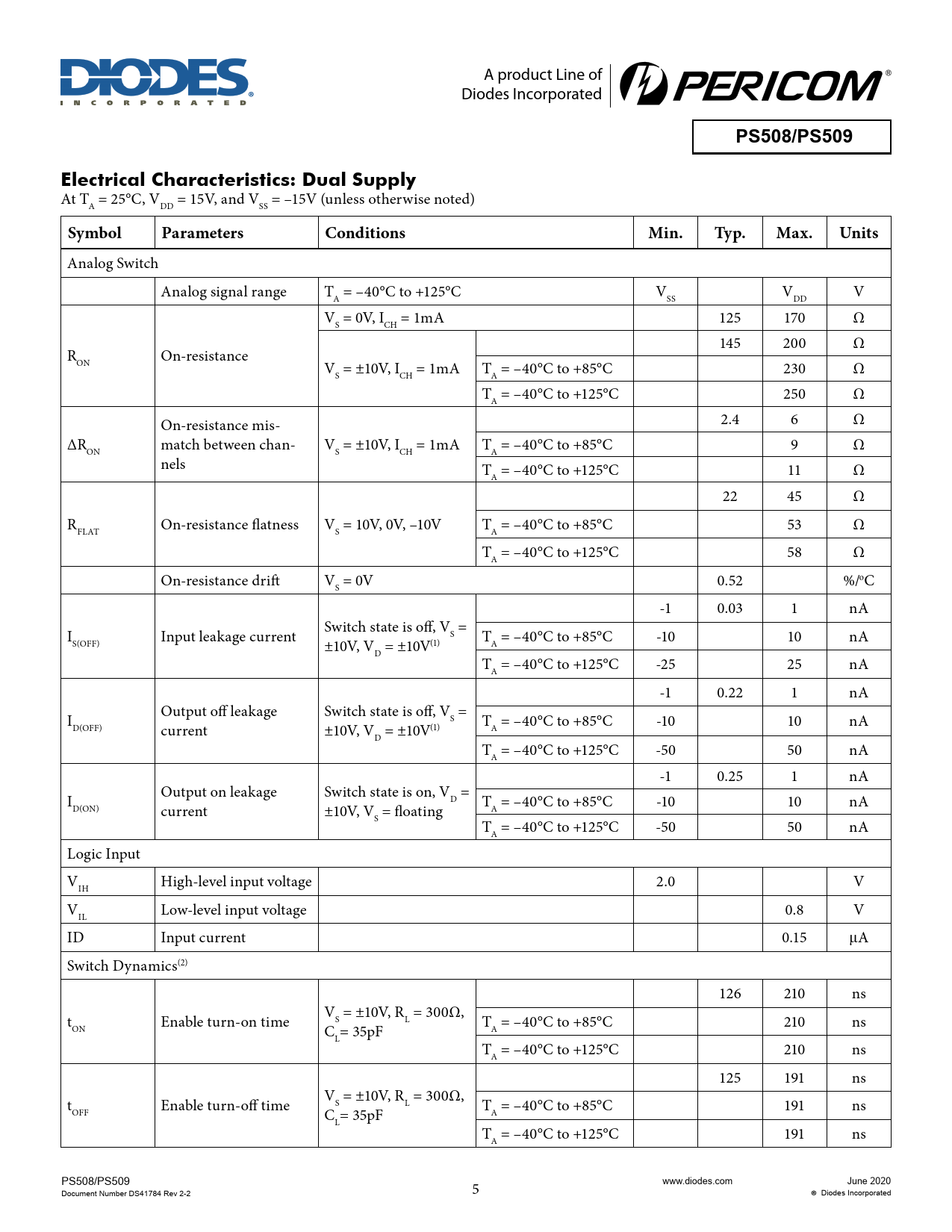 Analog Switch Analog signal range T = –40°C to +125°C V V V A SS DD V = 0V, I = 1mA 125 170 Ω S CH 145 200 Ω R On-resistance ON V = ±10V, I = 1mA T = –40°C to +85°C 230 Ω S CH A T = –40°C to +125°C 250 Ω A On-resistance mis- 2.4 6 Ω ∆R match between chan- V = ±10V, I = 1mA T = –40°C to +85°C 9 Ω ON S CH A nels T = –40°C to +125°C 11 Ω A 22 45 Ω R On-resistance flatness V = 10V, 0V, –10V T = –40°C to +85°C 53 Ω FLAT S A T = –40°C to +125°C 58 Ω A On-resistance drift V = 0V 0.52 %/oC S -1 0.03 1 nA I Input leakage current Switch state is off, V = S T = –40°C to +85°C -10 10 nA S(OFF) ±10V, V = ±10V(1) A D T = –40°C to +125°C -25 25 nA A -1 0.22 1 nA I Output off leakage Switch state is off, V = S T = –40°C to +85°C -10 10 nA D(OFF) current ±10V, V = ±10V(1) A D T = –40°C to +125°C -50 50 nA A -1 0.25 1 nA I Output on leakage Switch state is on, V = D T = –40°C to +85°C -10 10 nA D(ON) current ±10V, V = floating A S T = –40°C to +125°C -50 50 nA A Logic Input V High-level input voltage 2.0 V IH V Low-level input voltage 0.8 V IL ID Input current 0.15 μA Switch Dynamics(2) 126 210 ns t Enable turn-on time V = ±10V, R = 300Ω, S L T = –40°C to +85°C 210 ns ON C = 35pF A L T = –40°C to +125°C 210 ns A 125 191 ns t Enable turn-off time V = ±10V, R = 300Ω, S L T = –40°C to +85°C 191 ns OFF C = 35pF A L T = –40°C to +125°C 191 ns A PS508/PS509 Document Number DS41784 Rev 2-2 5 www.diodes.com June 2020 Diodes Incorporated