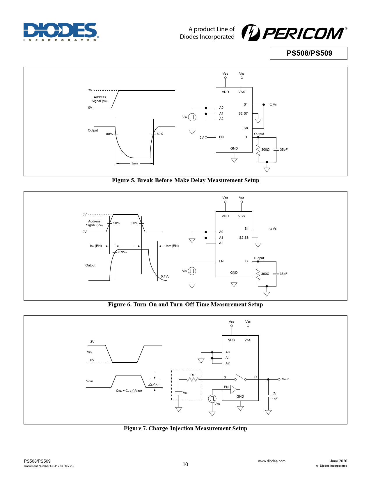 A product Line of Diodes Incorporated PS508/PS509 VDD VSS 3V VDD VSS Address Signal (VIN) S1 VS 0V A0 A1 S2-S7 VIN A2 S8 Output 80% 80% Output 2V EN D GND 300Ω 35pF tBBM Figure 5. Break-Before-Make Delay Measurement Setup VDD VSS 3V VDD VSS Address Signal (V 50% 50% IN) S1 VS 0V A0 A1 S2-S8 A2 tON (EN) tOFF (EN) 0.9VS Output EN D Output VIN GND 300Ω 35pF 0.1VS Figure 6. Turn-On and Turn-Off Time Measurement Setup VDD VSS 3V VDD VSS VEN A0 0V A1 A2 RS S D V VOUT OUT VOUT EN QINJ = CL x VOUT VS CL GND 1nF VEN Figure 7. Charge-Injection Measurement Setup PS508/PS509 Document Number DS41784 Rev 2-2 10 www.diodes.com June 2020 Diodes Incorporated
