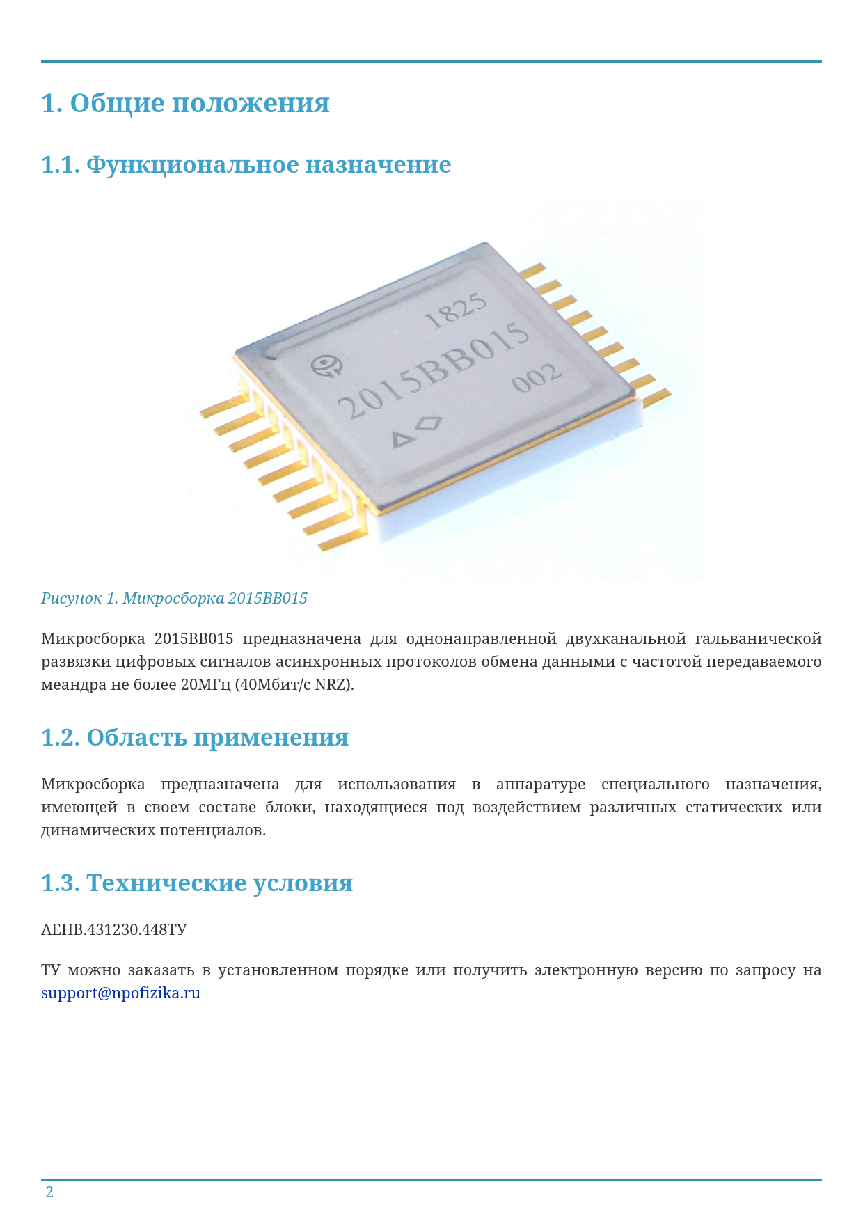 АЕНВ.431230.448ТУ ТУ можно заказать в установленном порядке или получить электронную версию по запросу на support@npofizika.ru 2 Document Outline Микросборка двухканальная гальванической развязки цифровых сигналов 2015ВВ015 : 1.9 Оглавление 1. Общие положения 1.1. Функциональное назначение 1.2. Область применения 1.3. Технические условия 2. Описание работы 3. Основные параметры 3.1. Рабочий диапазон 3.2. Электрические параметры 3.3. Назначение выводов и их описание 3.4. Конструктивное исполнение 4. Указания по применению и эксплуатации 4.1. Типовая схема включения 4.2. Конструктивные решения 5. Справочная информация 5.1. Условное графическое обозначение 5.2. Осциллограммы работы микросборки 5.3. Отладочная плата 6. Обратная связь 7. Лист изменений