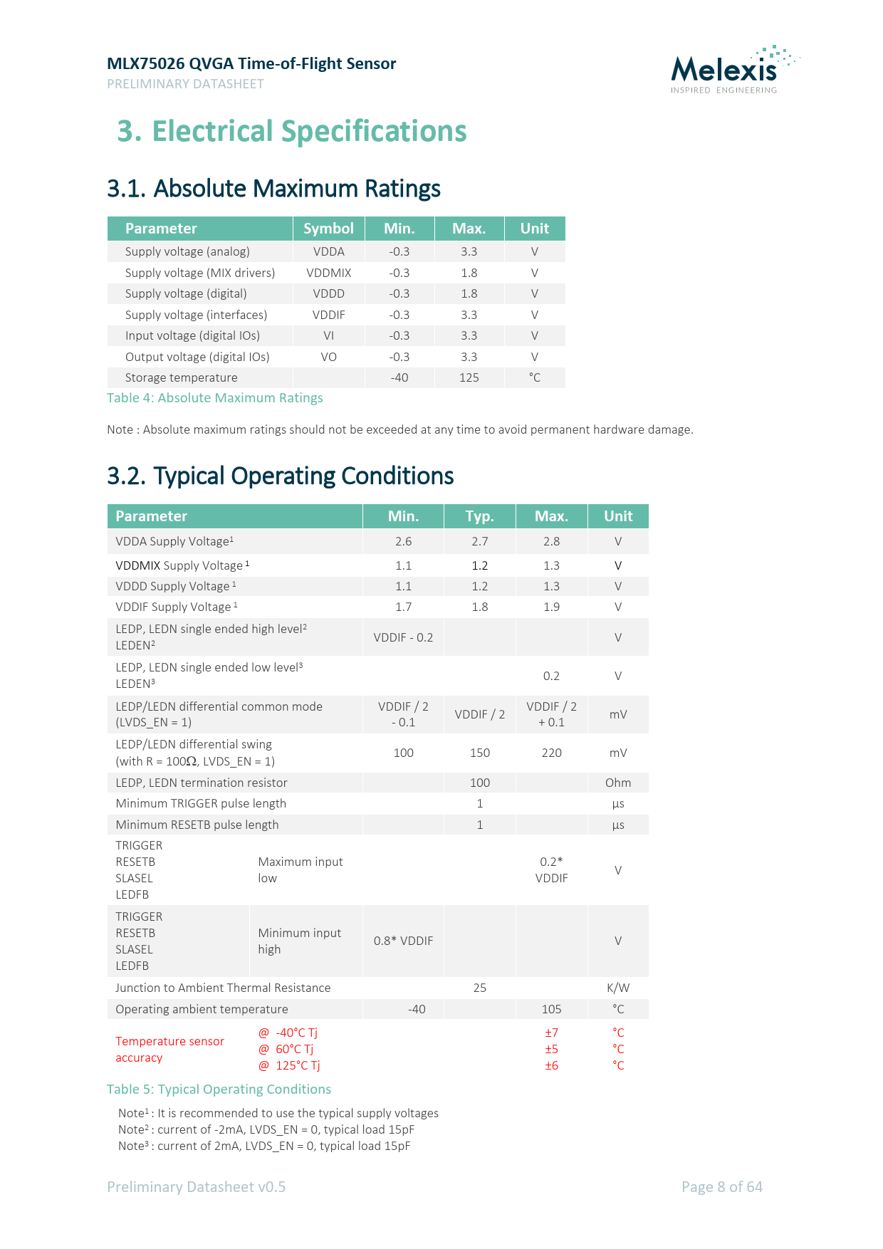 | 页数 / 页 | 64 / 8 — MLX75026 QVGA Time-of-Flight Sensor. 3. Electrical Specifications. … |