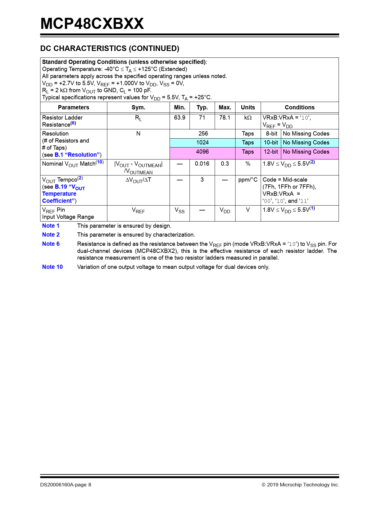 link to page 15 link to page 15 link to page 97 link to page 15 link to page 15 link to page 101 link to page 101 link to page 101 link to page 15 link to page 15 link to page 15 link to page 15 link to page 15 link to page 15 link to page 15 link to page 15 link to page 15 link to page 15 MCP48CXBXXDC CHARACTERISTICS (CONTINUED)Standard Operating Conditions (unless otherwise specified) : Operating Temperature: -40°C TA +125°C (Extended) All parameters apply across the specified operating ranges unless noted. VDD = +2.7V to 5.5V, VREF = +1.000V to VDD, VSS = 0V, RL = 2 k from VOUT to GND, CL = 100 pF. Typical specifications represent values for VDD = 5.5V, TA = +25°C. ParametersSym.Min.Typ.Max.UnitsConditions Resistor Ladder RL 63.9 71 78.1 k VRxB:VRxA = ‘10’, Resistance (6) VREF = VDD Resolution N 256 Taps 8-bit No Missing Codes (# of Resistors and 1024 Taps 10-bit No Missing Codes # of Taps) 4096 Taps 12-bit No Missing Codes (see B.1 “Resolution” ) Nominal VOUT Match( 10 ) |VOUT - VOUTMEAN| — 0.016 0.3 % 1.8V VDD 5.5V( 2) /VOUTMEAN VOUT Tempco( 2 ) VOUT/T — 3 — ppm/°C Code = Mid-scale (see B.19 “VOUT (7Fh, 1FFh or 7FFh), Temperature VRxB:VRxA = Coefficient” ) ‘00’, ‘10’, and ‘11’ VREF Pin VREF VSS — VDD V 1.8V VDD 5.5V( 1) Input Voltage Range Note 1 This parameter is ensured by design. Note 2 This parameter is ensured by characterization. Note 6 Resistance is defined as the resistance between the VREF pin (mode VRxB:VRxA = ‘10’) to VSS pin. For dual-channel devices (MCP48CXBX2), this is the effective resistance of each resistor ladder. The resistance measurement is one of the two resistor ladders measured in parallel. Note 10 Variation of one output voltage to mean output voltage for dual devices only. DS20006160A-page 8 2019 Microchip Technology Inc. Document Outline 8/10/12-Bit Digital-to-Analog Converters, 1 LSb INL Single/Dual Voltage Outputs with SPI Interface Features Package Types General Description Applications MCP48CVBX1 Block Diagram (Single-Channel Output) MCP48CVBX2 Block Diagram (Dual-Channel Output) Family Device Features 1.0 Electrical Characteristics Absolute Maximum Ratings DC Characteristics DC Notes 1.1 Timing Waveforms and Requirements FIGURE 1-1: VOUT Settling Time Waveforms. TABLE 1-1: Wiper Settling Timing FIGURE 1-2: LAT Pin Waveforms. TABLE 1-2: LAT Pin Timing FIGURE 1-3: Power-on and Brown-out Reset Waveforms. FIGURE 1-4: SPI Power-Down Waveforms. TABLE 1-3: RESET and Power-Down Timing 1.2 SPI Mode Timing Waveforms and Requirements FIGURE 1-5: SPI Timing Waveform (Mode = ‘11’). TABLE 1-4: SPI Requirements (Mode = ‘11’) FIGURE 1-6: SPI Timing Waveform (Mode = 00). TABLE 1-5: SPI Requirements (Mode = 00) Temperature Specifications 2.0 Typical Performance Curves 2.1 Electrical Data FIGURE 2-1: Average Device Supply Current vs. FSCK Frequency, Voltage and Temperature - Active Interface, VRxB:VRxA = ‘00’, (VDD Mode). FIGURE 2-2: Average Device Supply Current vs. FSCK Frequency, Voltage and Temperature - Active Interface, VRxB:VRxA = ‘01’ (Band Gap Mode). FIGURE 2-3: Average Device Supply Current vs. FSCK Frequency, Voltage and Temperature - Active Interface, VRxB:VRxA = ‘11’ (VREF Buffered Mode). FIGURE 2-4: Average Device Supply Current - Inactive Interface (SCK = VIH or VIL) vs. Voltage and Temperature, VRxB:VRxA = ‘00’ (VDD Mode). FIGURE 2-5: Average Device Supply Current - Inactive Interface (SCK = VIH or VIL) vs. Voltage and Temperature, VRxB:VRxA = ‘01’ (Band Gap Mode). FIGURE 2-6: Average Device Supply Current - Inactive Interface (SCK = VIH or VIL) vs. Voltage and Temperature, VRxB:VRxA = ‘11’ (VREF Buffered Mode). FIGURE 2-7: Average Device Supply Current vs. FSCK Frequency, Voltage and Temperature - Active Interface, VRxB:VRxA = ‘10’ (VREF Unbuffered Mode). FIGURE 2-8: Average Device Supply Active Current (IDDA) (at 5.5V and FSCK = 50 MHz) vs. Temperature and DAC Reference Voltage Mode. FIGURE 2-9: Average Device Supply Current - Inactive Interface (SCK = VIH or VIL) vs. Voltage and Temperature, VRxB:VRxA = ‘10’ (VREF Unbuffered Mode). 2.2 Linearity Data FIGURE 2-10: Total Unadjusted Error (VOUT) vs. DAC Code and Temperature (Single-Channel - MCP48CXB21), VDD = 5.5V. FIGURE 2-11: Total Unadjusted Error (VOUT) vs. DAC Code and Temperature (Single-Channel - MCP48CXB21), VDD = 2.7V. FIGURE 2-12: Total Unadjusted Error (VOUT) vs. DAC Code and Temperature (Single-Channel - MCP48CXB21), VDD = 1.8V. FIGURE 2-13: Total Unadjusted Error (VOUT) vs. DAC Code and Temperature (Dual-Channel - MCP48CXB22), VDD = 5.5V. FIGURE 2-14: Total Unadjusted Error (VOUT) vs. DAC Code and Temperature (Dual-Channel - MCP48CXB22), VDD = 2.7V. FIGURE 2-15: Total Unadjusted Error (VOUT) vs. DAC Code and Temperature (Dual-Channel - MCP48CXB22), VDD = 1.8V. FIGURE 2-16: INL Error vs. DAC Code and Temperature (Single-Channel - MCP48CXB21), VDD = 5.5V. FIGURE 2-17: INL Error vs. DAC Code and Temperature (Single-Channel - MCP48CXB21), VDD = 2.7V. FIGURE 2-18: INL Error vs. DAC Code and Temperature (Single-Channel - MCP48CXB21), VDD = 1.8V. FIGURE 2-19: INL Error vs. DAC Code and Temperature (Dual-Channel - MCP48CXB22), VDD = 5.5V. FIGURE 2-20: INL Error vs. DAC Code and Temperature (Dual-Channel - MCP48CXB22), VDD = 2.7V. FIGURE 2-21: INL Error vs. DAC Code and Temperature (Dual-Channel - MCP48CXB22), VDD = 1.8V. FIGURE 2-22: DNL Error vs. DAC Code and Temperature (Single-Channel - MCP48CXB21), VDD = 5.5V. FIGURE 2-23: DNL Error vs. DAC Code and Temperature (Single-Channel - MCP48CXB21), VDD = 2.7V. FIGURE 2-24: DNL Error vs. DAC Code and Temperature (Single-Channel - MCP48CXB21), VDD = 1.8V. FIGURE 2-25: DNL Error vs. DAC Code and Temperature (Dual-Channel - MCP48CXB22), VDD = 5.5V. FIGURE 2-26: DNL Error vs. DAC Code and Temperature (Dual-Channel - MCP48CXB22), VDD = 2.7V. FIGURE 2-27: DNL Error vs. DAC Code and Temperature (Dual-Channel - MCP48CXB22), VDD = 1.8V. FIGURE 2-28: Total Unadjusted Error (VOUT) vs