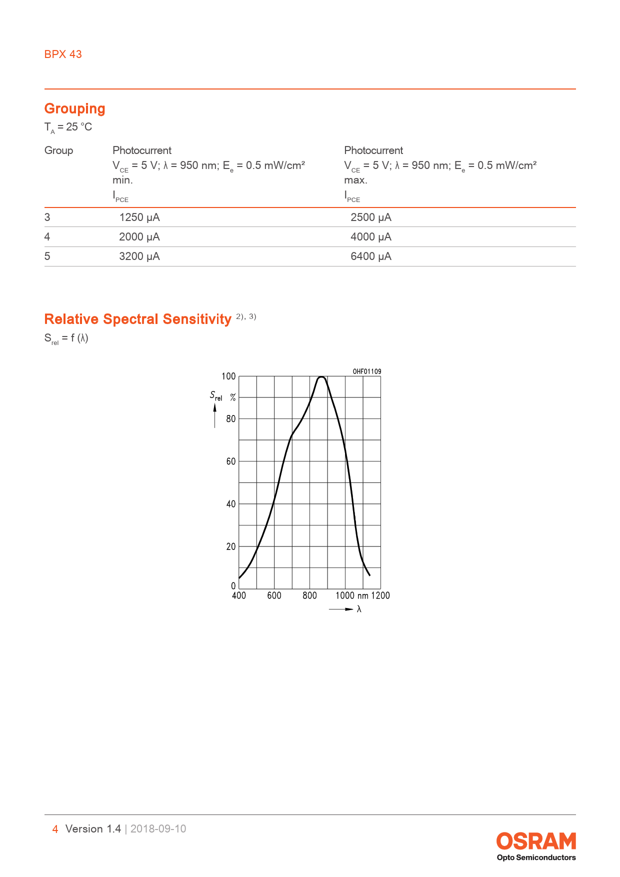 link to page 13 link to page 13 BPX 43 Grouping T = 25 °C A Group Photocurrent Photocurrent V = 5 V; λ = 950 nm; E = 0.5 mW/cm² V = 5 V; λ = 950 nm; E = 0.5 mW/cm² CE e CE e min. max. I I PCE PCE 3 1250 µA 2500 µA 4 2000 µA 4000 µA 5 3200 µA 6400 µA Relative Spectral Sensitivity 2), 3) S = f (λ) rel 4 Version 1.4 | 2018-09-10