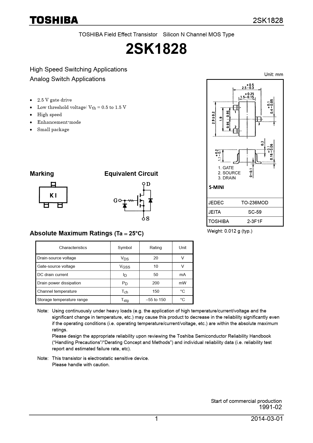 Weight: 0.012 g (typ.) Characteristics Symbol Rating Unit Drain-source voltage VDS 20 V Gate-source voltage VGSS 10 V DC drain current ID 50 mA Drain power dissipation PD 200 mW Channel temperature Tch 150 °C Storage temperature range Tstg −55 to 150 °C Note: Using continuously under heavy loads (e.g. the application of high temperature/current/voltage and the significant change in temperature, etc.) may cause this product to decrease in the reliability significantly even if the operating conditions (i.e. operating temperature/current/voltage, etc.) are within the absolute maximum ratings. Please design the appropriate reliability upon reviewing the Toshiba Semiconductor Reliability Handbook (“Handling Precautions”/“Derating Concept and Methods”) and individual reliability data (i.e. reliability test report and estimated failure rate, etc). Note: This transistor is electrostatic sensitive device. Please handle with caution. Start of commercial production 1991-02 1 2014-03-01 Document Outline TOSHIBA Field Effect Transistor Silicon N Channel MOS Type Marking Equivalent Circuit Absolute Maximum Ratings (Ta  25°C) Electrical Characteristics (Ta  25°C) Switching Time Test Circuit RESTRICTIONS ON PRODUCT USE