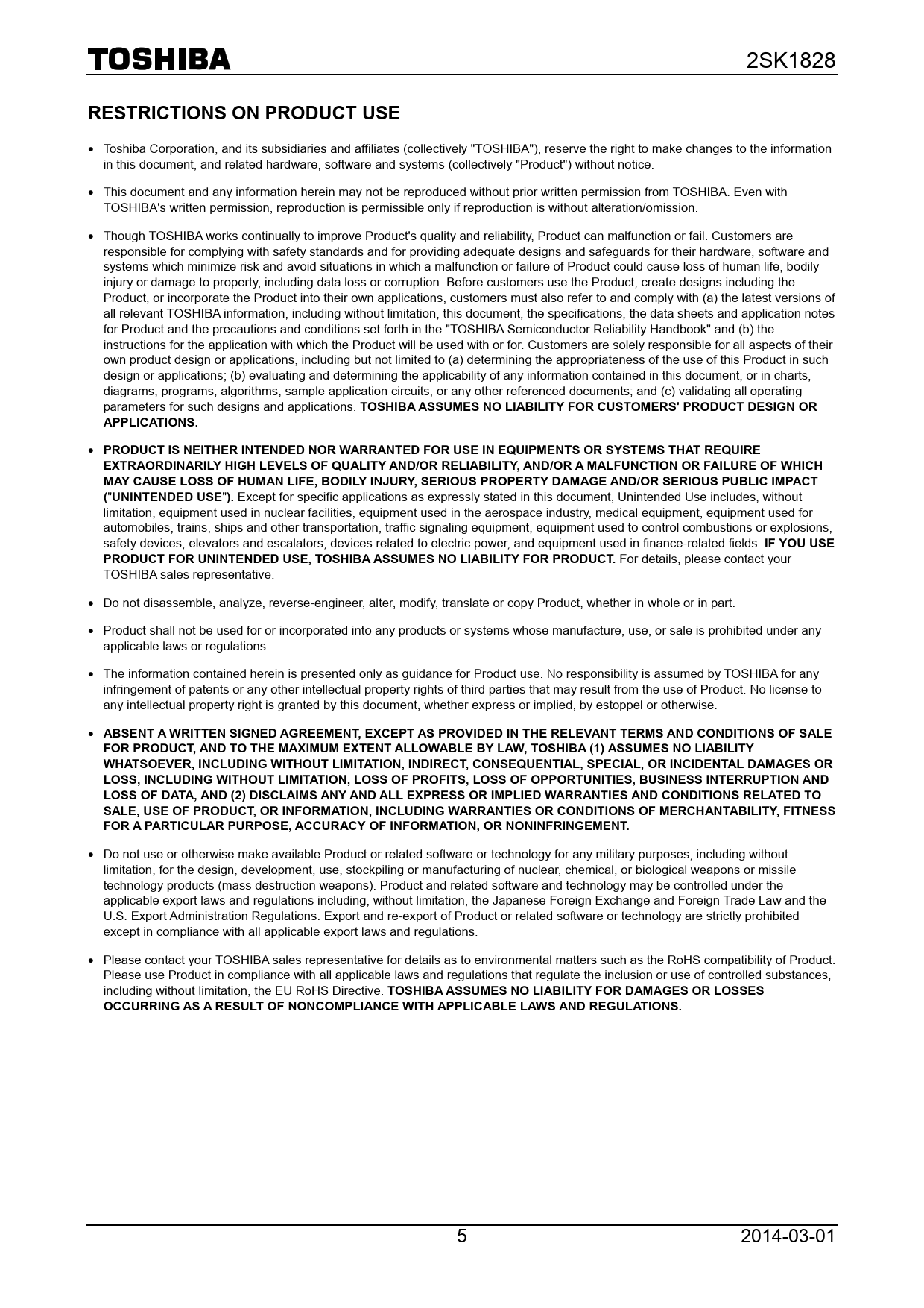 2SK1828 RESTRICTIONS ON PRODUCT USE • Toshiba Corporation, and its subsidiaries and affiliates (collectively "TOSHIBA"), reserve the right to make changes to the information in this document, and related hardware, software and systems (collectively "Product") without notice. • This document and any information herein may not be reproduced without prior written permission from TOSHIBA. Even with TOSHIBA's written permission, reproduction is permissible only if reproduction is without alteration/omission. • Though TOSHIBA works continually to improve Product's quality and reliability, Product can malfunction or fail. Customers are responsible for complying with safety standards and for providing adequate designs and safeguards for their hardware, software and systems which minimize risk and avoid situations in which a malfunction or failure of Product could cause loss of human life, bodily injury or damage to property, including data loss or corruption. Before customers use the Product, create designs including the Product, or incorporate the Product into their own applications, customers must also refer to and comply with (a) the latest versions of all relevant TOSHIBA information, including without limitation, this document, the specifications, the data sheets and application notes for Product and the precautions and conditions set forth in the "TOSHIBA Semiconductor Reliability Handbook" and (b) the instructions for the application with which the Product will be used with or for. Customers are solely responsible for all aspects of their own product design or applications, including but not limited to (a) determining the appropriateness of the use of this Product in such design or applications; (b) evaluating and determining the applicability of any information contained in this document, or in charts, diagrams, programs, algorithms, sample application circuits, or any other referenced documents; and (c) validating all operating parameters for such designs and applications. TOSHIBA ASSUMES NO LIABILITY FOR CUSTOMERS' PRODUCT DESIGN OR APPLICATIONS. • PRODUCT IS NEITHER INTENDED NOR WARRANTED FOR USE IN EQUIPMENTS OR SYSTEMS THAT REQUIREEXTRAORDINARILY HIGH LEVELS OF QUALITY AND/OR RELIABILITY, AND/OR A MALFUNCTION OR FAILURE OF WHICH MAY CAUSE LOSS OF HUMAN LIFE, BODILY INJURY, SERIOUS PROPERTY DAMAGE AND/OR SERIOUS PUBLIC IMPACT ( " UNINTENDED USE " ). Except for specific applications as expressly stated in this document, Unintended Use includes, without limitation, equipment used in nuclear facilities, equipment used in the aerospace industry, medical equipment, equipment used for automobiles, trains, ships and other transportation, traffic signaling equipment, equipment used to control combustions or explosions, safety devices, elevators and escalators, devices related to electric power, and equipment used in finance-related fields. IF YOU USE PRODUCT FOR UNINTENDED USE, TOSHIBA ASSUMES NO LIABILITY FOR PRODUCT. For details, please contact your TOSHIBA sales representative. • Do not disassemble, analyze, reverse-engineer, alter, modify, translate or copy Product, whether in whole or in part. • Product shall not be used for or incorporated into any products or systems whose manufacture, use, or sale is prohibited under any applicable laws or regulations. • The information contained herein is presented only as guidance for Product use. No responsibility is assumed by TOSHIBA for any infringement of patents or any other intellectual property rights of third parties that may result from the use of Product. No license to any intellectual property right is granted by this document, whether express or implied, by estoppel or otherwise. • ABSENT A WRITTEN SIGNED AGREEMENT, EXCEPT AS PROVIDED IN THE RELEVANT TERMS AND CONDITIONS OF SALEFOR PRODUCT, AND TO THE MAXIMUM EXTENT ALLOWABLE BY LAW, TOSHIBA (1) ASSUMES NO LIABILITY WHATSOEVER, INCLUDING WITHOUT LIMITATION, INDIRECT, CONSEQUENTIAL, SPECIAL, OR INCIDENTAL DAMAGES OR LOSS, INCLUDING WITHOUT LIMITATION, LOSS OF PROFITS, LOSS OF OPPORTUNITIES, BUSINESS INTERRUPTION AND LOSS OF DATA, AND (2) DISCLAIMS ANY AND ALL EXPRESS OR IMPLIED WARRANTIES AND CONDITIONS RELATED TO SALE, USE OF PRODUCT, OR INFORMATION, INCLUDING WARRANTIES OR CONDITIONS OF MERCHANTABILITY, FITNESS FOR A PARTICULAR PURPOSE, ACCURACY OF INFORMATION, OR NONINFRINGEMENT. • Do not use or otherwise make available Product or related software or technology for any military purposes, including without limitation, for the design, development, use, stockpiling or manufacturing of nuclear, chemical, or biological weapons or missile technology products (mass destruction weapons). Product and related software and technology may be controlled under the applicable export laws and regulations including, without limitation, the Japanese Foreign Exchange and Foreign Trade Law and the U.S. Export Administration Regulations. Export and re-export of Product or related software or technology are strictly prohibited except in compliance with all applicable export laws and regulations. • Please contact your TOSHIBA sales representative for details as to environmental matters such as the RoHS compatibility of Product. Please use Product in compliance with all applicable laws and regulations that regulate the inclusion or use of controlled substances, including without limitation, the EU RoHS Directive. TOSHIBA ASSUMES NO LIABILITY FOR DAMAGES OR LOSSES OCCURRING AS A RESULT OF NONCOMPLIANCE WITH APPLICABLE LAWS AND REGULATIONS. 5 2014-03-01 Document Outline TOSHIBA Field Effect Transistor Silicon N Channel MOS Type Marking Equivalent Circuit Absolute Maximum Ratings (Ta 25°C) Electrical Characteristics (Ta 25°C) Switching Time Test Circuit RESTRICTIONS ON PRODUCT USE
