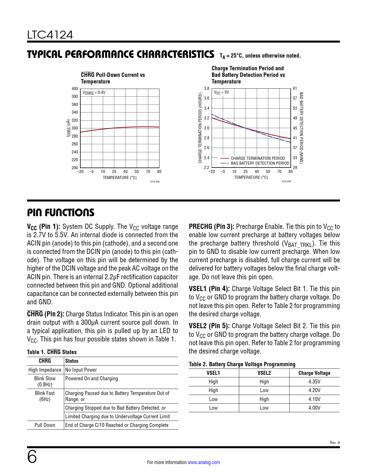 link to page 6 link to page 6 link to page 6 LTC4124 TYPICAL PERFORMANCE CHARACTERISTICS TA = 25°C, unless otherwise noted.Charge Termination Period andCHRG Pull-Down Current vsBad Battery Detection Period vsTemperatureTemperature 400 3.8 61 V BAD BA CHRG = 0.4V VCC = 5V 300 3.6 57 360 TTER 3.4 53 340 Y DETECTION PERIOD (MINS) 320 3.2 49 (µA) 300 TION PERIOD (HOURS) 3.0 45 I CHRG 280 2.8 41 260 2.6 37 240 220 2.4 CHARGE TERMINATION PERIOD 33 CHARGE TERMINA BAD BATTERY DETECTION PERIOD 200 2.2 29 –20 –5 10 25 40 55 70 85 –20 –5 10 25 40 55 70 85 TEMPERATURE (°C) TEMPERATURE (°C) 4124 G08 4124 G09 PIN FUNCTIONS VCC (Pin 1): System DC Supply. The VCC voltage range PRECHG (Pin 3): Precharge Enable. Tie this pin to VCC to is 2.7V to 5.5V. An internal diode is connected from the enable low current precharge at battery voltages below ACIN pin (anode) to this pin (cathode), and a second one the precharge battery threshold (VBAT_TRKL). Tie this is connected from the DCIN pin (anode) to this pin (cath- pin to GND to disable low current precharge. When low ode). The voltage on this pin will be determined by the current precharge is disabled, full charge current will be higher of the DCIN voltage and the peak AC voltage on the delivered for battery voltages below the final charge volt- ACIN pin. There is an internal 2.2µF rectification capacitor age. Do not leave this pin open. connected between this pin and GND. Optional additional VSEL1 (Pin 4): Charge Voltage Select Bit 1. Tie this pin capacitance can be connected externally between this pin to V and GND. CC or GND to program the battery charge voltage. Do not leave this pin open. Refer to Table 2 for programming CHRG (Pin 2): Charge Status Indicator. This pin is an open the desired charge voltage. drain output with a 300µA current source pull down. In VSEL2 (Pin 5): Charge Voltage Select Bit 2. Tie this pin a typical application, this pin is pulled up by an LED to to V V CC or GND to program the battery charge voltage. Do CC. This pin has four possible states shown in Table 1. not leave this pin open. Refer to Table 2 for programming Table 1. CHRG States the desired charge voltage. CHRGStatusTable 2. Battery Charge Voltage Programming High Impedance No Input Power VSEL1VSEL2Charge Voltage Blink Slow Powered On and Charging (0.8Hz) High High 4.35V Blink Fast Charging Paused due to Battery Temperature Out of High Low 4.20V (6Hz) Range, or Low High 4.10V Charging Stopped due to Bad Battery Detected, or Low Low 4.00V Limited Charging due to Undervoltage Current Limit Pull Down End of Charge C/10 Reached or Charging Complete Rev. A 6 For more information www.analog.com Document Outline Features Applications Typical Application Description Absolute Maximum Ratings Order Information Pin Configuration Electrical Characteristics Typical Performance Characteristics Pin Functions Functional Block Diagram Operation Applications Information Typical Applications Package Description Revision History Typical Application Related Parts