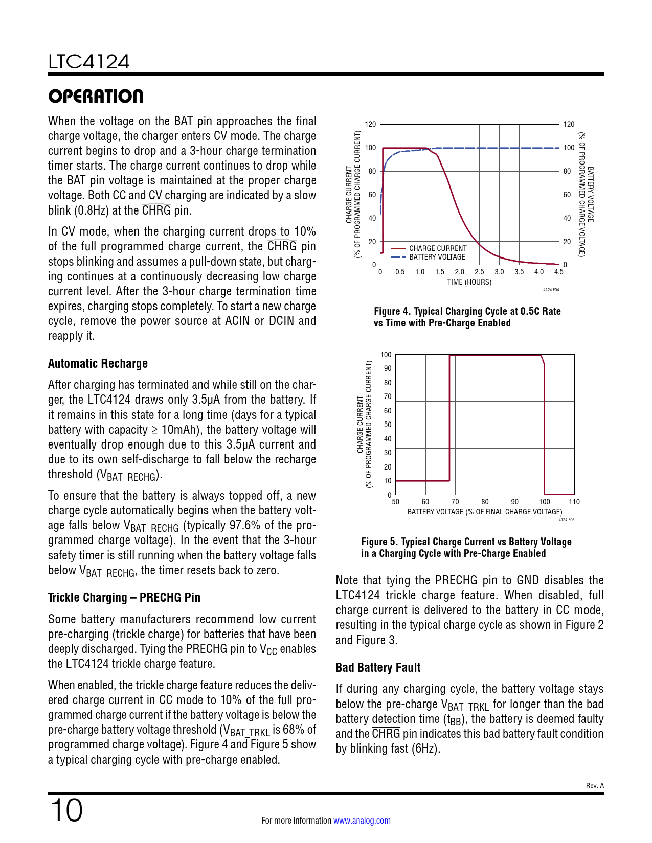 link to page 10 link to page 10 link to page 9 link to page 9 LTC4124 OPERATION When the voltage on the BAT pin approaches the final 120 120 charge voltage, the charger enters CV mode. The charge (% OF PROGRAMMED CHARGE VOL current begins to drop and a 3-hour charge termination 100 100 timer starts. The charge current continues to drop while BA 80 80 T the BAT pin voltage is maintained at the proper charge TER Y VOL voltage. Both CC and CV charging are indicated by a slow 60 60 blink (0.8Hz) at the CHRG pin. TAGE CHARGE CURRENT 40 40 In CV mode, when the charging current drops to 10% T of the full programmed charge current, the CHRG pin 20 20 AGE) CHARGE CURRENT stops blinking and assumes a pull-down state, but charg- (% OF PROGRAMMED CHARGE CURRENT) BATTERY VOLTAGE 0 0 ing continues at a continuously decreasing low charge 0 0.5 1.0 1.5 2.0 2.5 3.0 3.5 4.0 4.5 TIME (HOURS) current level. After the 3-hour charge termination time 4124 F04 expires, charging stops completely. To start a new charge Figure 4. Typical Charging Cycle at 0.5C Rate cycle, remove the power source at ACIN or DCIN and vs Time with Pre-Charge Enabled reapply it. 100 Automatic Recharge 90 After charging has terminated and while still on the char- 80 ger, the LTC4124 draws only 3.5µA from the battery. If 70 it remains in this state for a long time (days for a typical 60 battery with capacity ≥ 10mAh), the battery voltage will 50 eventually drop enough due to this 3.5µA current and 40 CHARGE CURRENT due to its own self-discharge to fall below the recharge 30 threshold (V 20 BAT_RECHG). 10 (% OF PROGRAMMED CHARGE CURRENT) To ensure that the battery is always topped off, a new 050 60 70 80 90 100 110 charge cycle automatically begins when the battery volt- BATTERY VOLTAGE (% OF FINAL CHARGE VOLTAGE) age falls below V 4124 F05 BAT_RECHG (typically 97.6% of the pro- grammed charge voltage). In the event that the 3-hour Figure 5. Typical Charge Current vs Battery Voltage safety timer is still running when the battery voltage falls in a Charging Cycle with Pre-Charge Enabled below VBAT_RECHG, the timer resets back to zero. Note that tying the PRECHG pin to GND disables the Trickle Charging – PRECHG Pin LTC4124 trickle charge feature. When disabled, full charge current is delivered to the battery in CC mode, Some battery manufacturers recommend low current resulting in the typical charge cycle as shown in Figure 2 pre-charging (trickle charge) for batteries that have been and Figure 3. deeply discharged. Tying the PRECHG pin to VCC enables the LTC4124 trickle charge feature. Bad Battery Fault When enabled, the trickle charge feature reduces the deliv- If during any charging cycle, the battery voltage stays ered charge current in CC mode to 10% of the full pro- below the pre-charge V grammed charge current if the battery voltage is below the BAT_TRKL for longer than the bad battery detection time (t pre-charge battery voltage threshold (V BB), the battery is deemed faulty BAT_TRKL is 68% of and the CHRG pin indicates this bad battery fault condition programmed charge voltage). Figure 4 and Figure 5 show by blinking fast (6Hz). a typical charging cycle with pre-charge enabled. Rev. A 10 For more information www.analog.com Document Outline Features Applications Typical Application Description Absolute Maximum Ratings Order Information Pin Configuration Electrical Characteristics Typical Performance Characteristics Pin Functions Functional Block Diagram Operation Applications Information Typical Applications Package Description Revision History Typical Application Related Parts