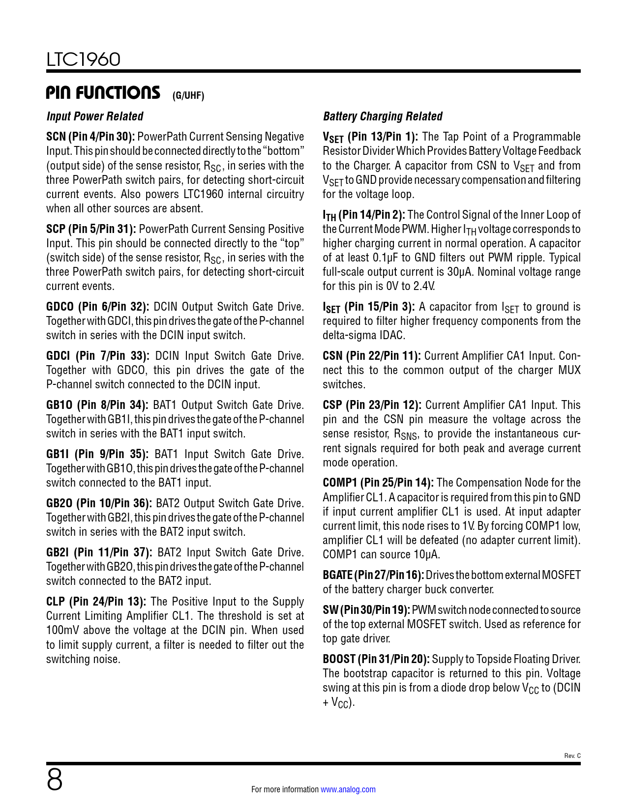 PIN FUNCTIONS (G/UHF). Input Power Related. Battery Charging Related. SCN (Pin 4/Pin 30):. VSET (Pin 13/Pin 1):