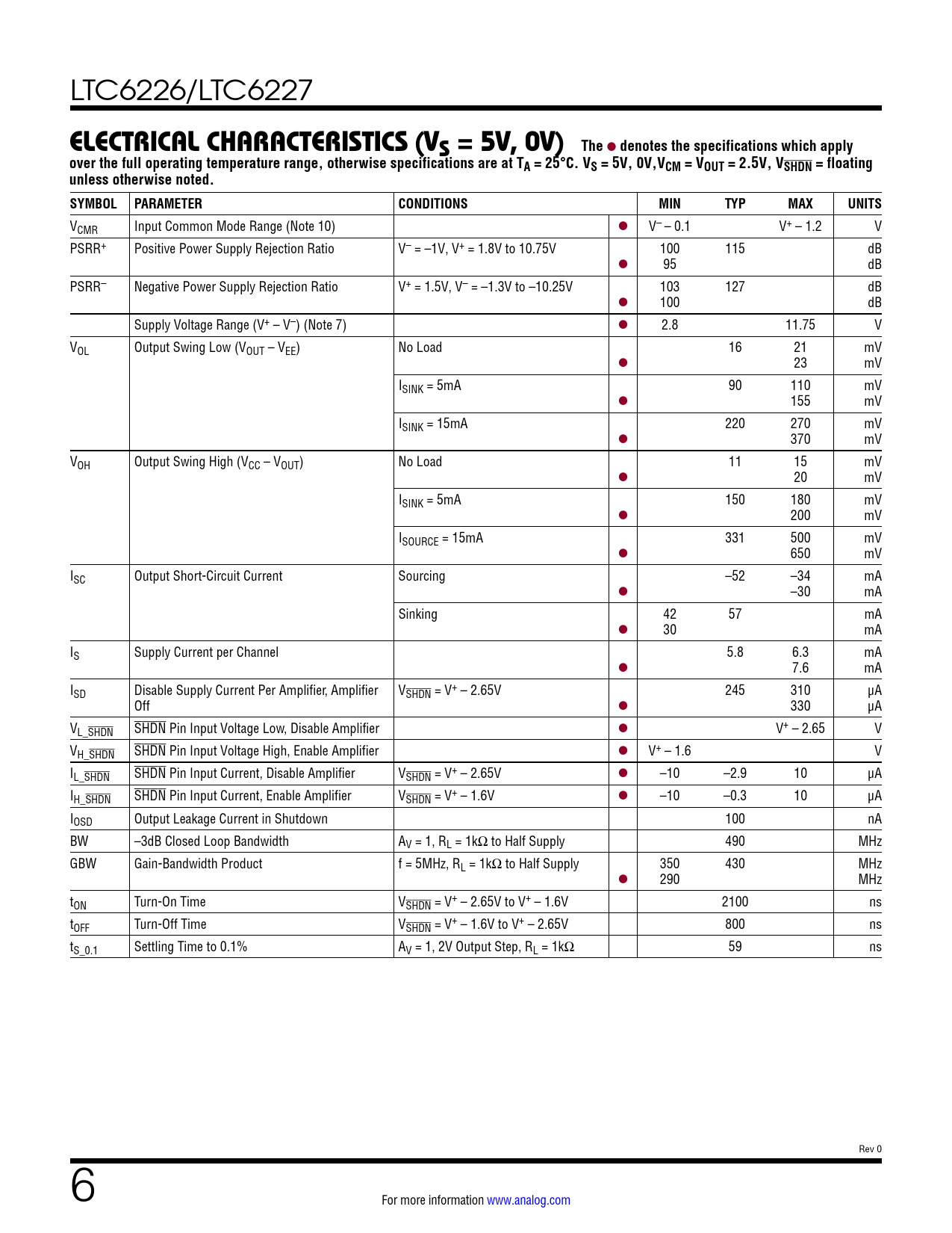 VCMR Input Common Mode Range (Note 10) l V– – 0.1 V+ – 1.2 V PSRR+ Positive Power Supply Rejection Ratio V– = –1V, V+ = 1.8V to 10.75V 100 115 dB l 95 dB PSRR– Negative Power Supply Rejection Ratio V+ = 1.5V, V– = –1.3V to –10.25V 103 127 dB l 100 dB Supply Voltage Range (V+ – V–) (Note 7) l 2.8 11.75 V VOL Output Swing Low (VOUT – VEE) No Load 16 21 mV l 23 mV ISINK = 5mA 90 110 mV l 155 mV ISINK = 15mA 220 270 mV l 370 mV VOH Output Swing High (VCC – VOUT) No Load 11 15 mV l 20 mV ISINK = 5mA 150 180 mV l 200 mV ISOURCE = 15mA 331 500 mV l 650 mV ISC Output Short-Circuit Current Sourcing –52 –34 mA l –30 mA Sinking 42 57 mA l 30 mA IS Supply Current per Channel 5.8 6.3 mA l 7.6 mA ISD Disable Supply Current Per Amplifier, Amplifier VSHDN = V+ – 2.65V 245 310 μA Off l 330 μA VL_SHDN SHDN Pin Input Voltage Low, Disable Amplifier l V+ – 2.65 V VH_SHDN SHDN Pin Input Voltage High, Enable Amplifier l V+ – 1.6 V IL_SHDN SHDN Pin Input Current, Disable Amplifier VSHDN = V+ – 2.65V l –10 –2.9 10 μA IH_SHDN SHDN Pin Input Current, Enable Amplifier VSHDN = V+ – 1.6V l –10 –0.3 10 μA IOSD Output Leakage Current in Shutdown 100 nA BW –3dB Closed Loop Bandwidth AV = 1, RL = 1kΩ to Half Supply 490 MHz GBW Gain-Bandwidth Product f = 5MHz, RL = 1kΩ to Half Supply 350 430 MHz l 290 MHz tON Turn-On Time VSHDN = V+ – 2.65V to V+ – 1.6V 2100 ns tOFF Turn-Off Time VSHDN = V+ – 1.6V to V+ – 2.65V 800 ns tS_0.1 Settling Time to 0.1% AV = 1, 2V Output Step, RL = 1kΩ 59 ns Rev 0 6 For more information www.analog.com Document Outline Features Applications Typical Application Description Absolute Maximum Ratings Pin Configuration Order Information Electrical Characteristics (VS = ±5V) Electrical Characteristics (VS = 5V, 0V) Electrical Characteristics (VS = 3V, 0V) Typical Performance Characteristics Pin Functions Applications Information Typical Applications Package Description Typical Application Related Parts