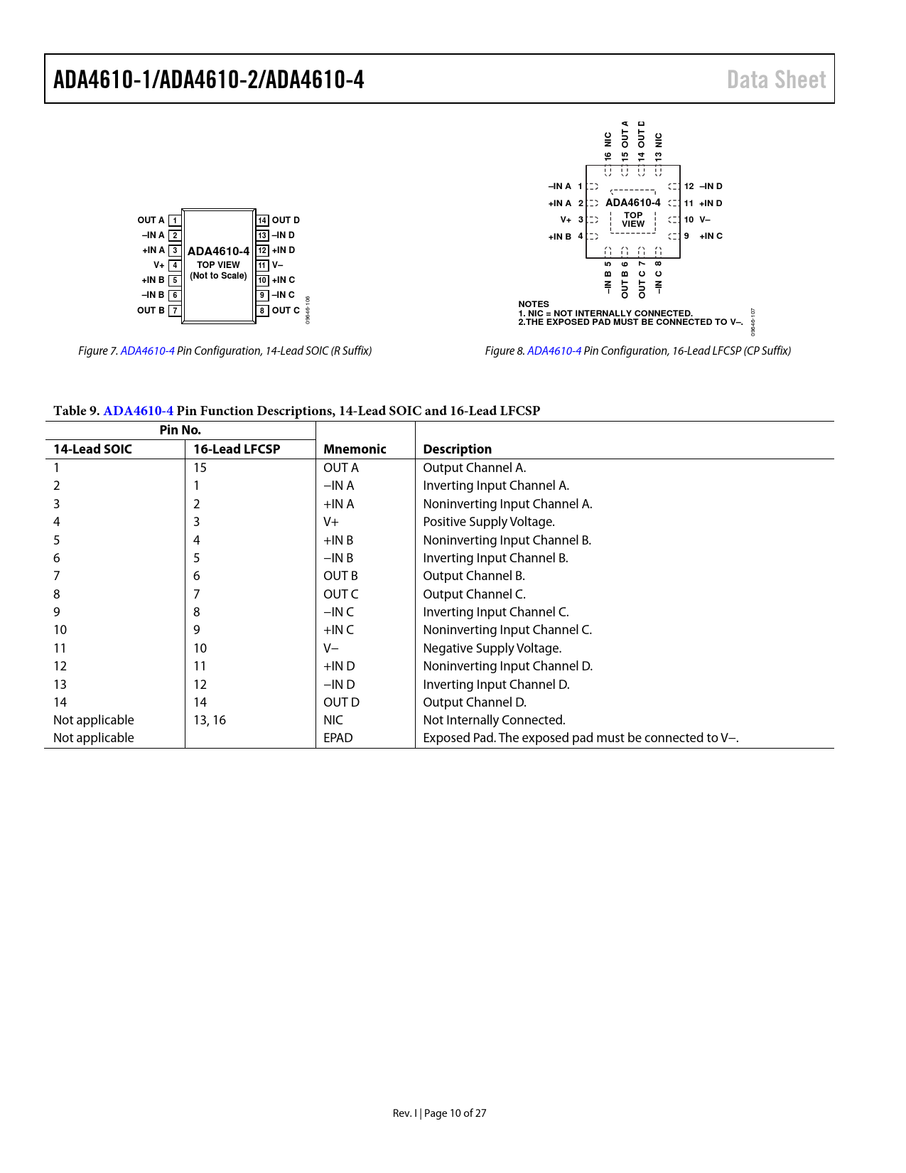 09646- Figure 7. ADA4610-4 Pin Configuration, 14-Lead SOIC (R Suffix) Figure 8. ADA4610-4 Pin Configuration, 16-Lead LFCSP (CP Suffix)