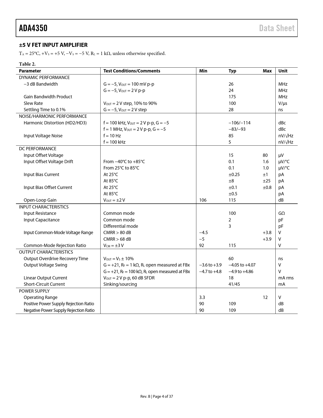 ADA4350. Data Sheet. ±5 V FET INPUT AMPLIFIER. Table 2. Parameter. Test Conditions/Comments. Min. Typ. Max. Unit