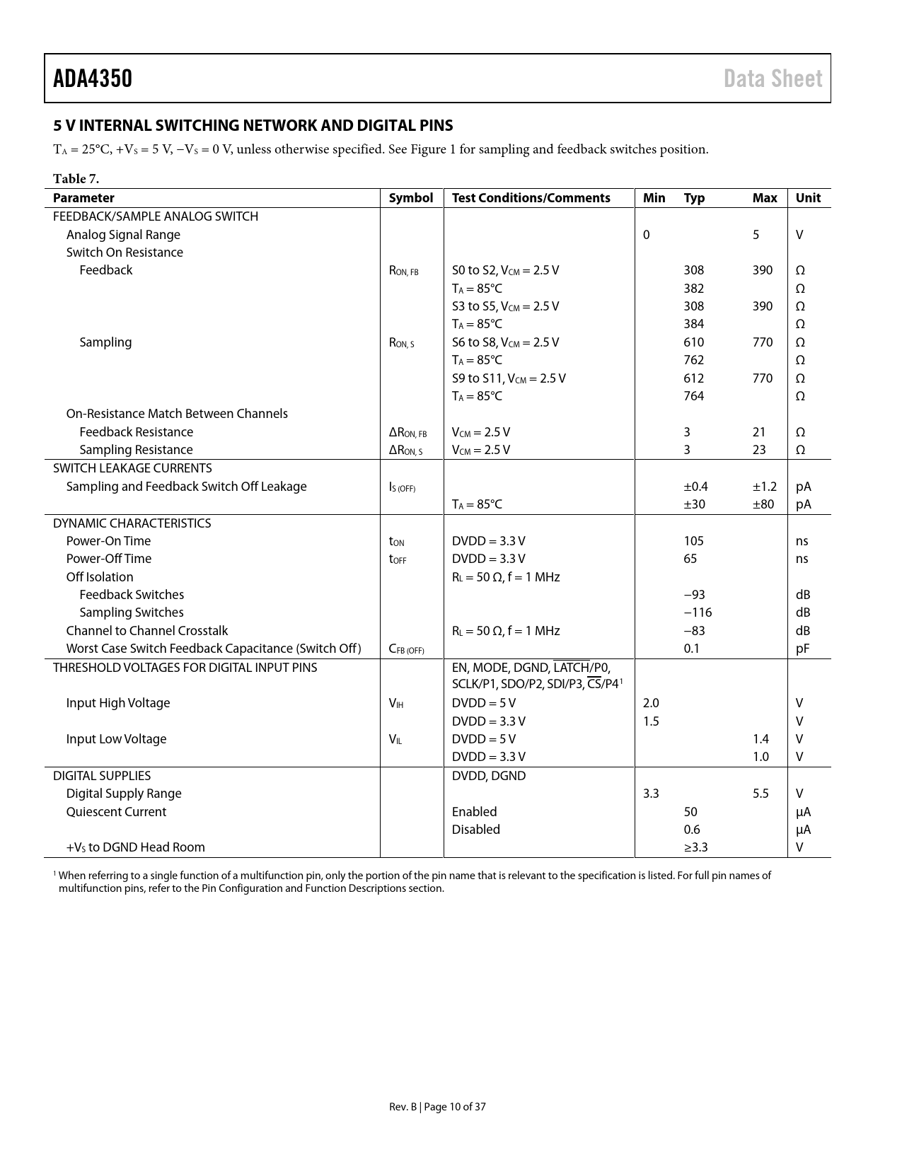 ADA4350 Data Sheet 5 V INTERNAL SWITCHING NETWORK AND DIGITAL PINS Table 7 Parameter Symbol Test Conditions/Comments Min Typ
