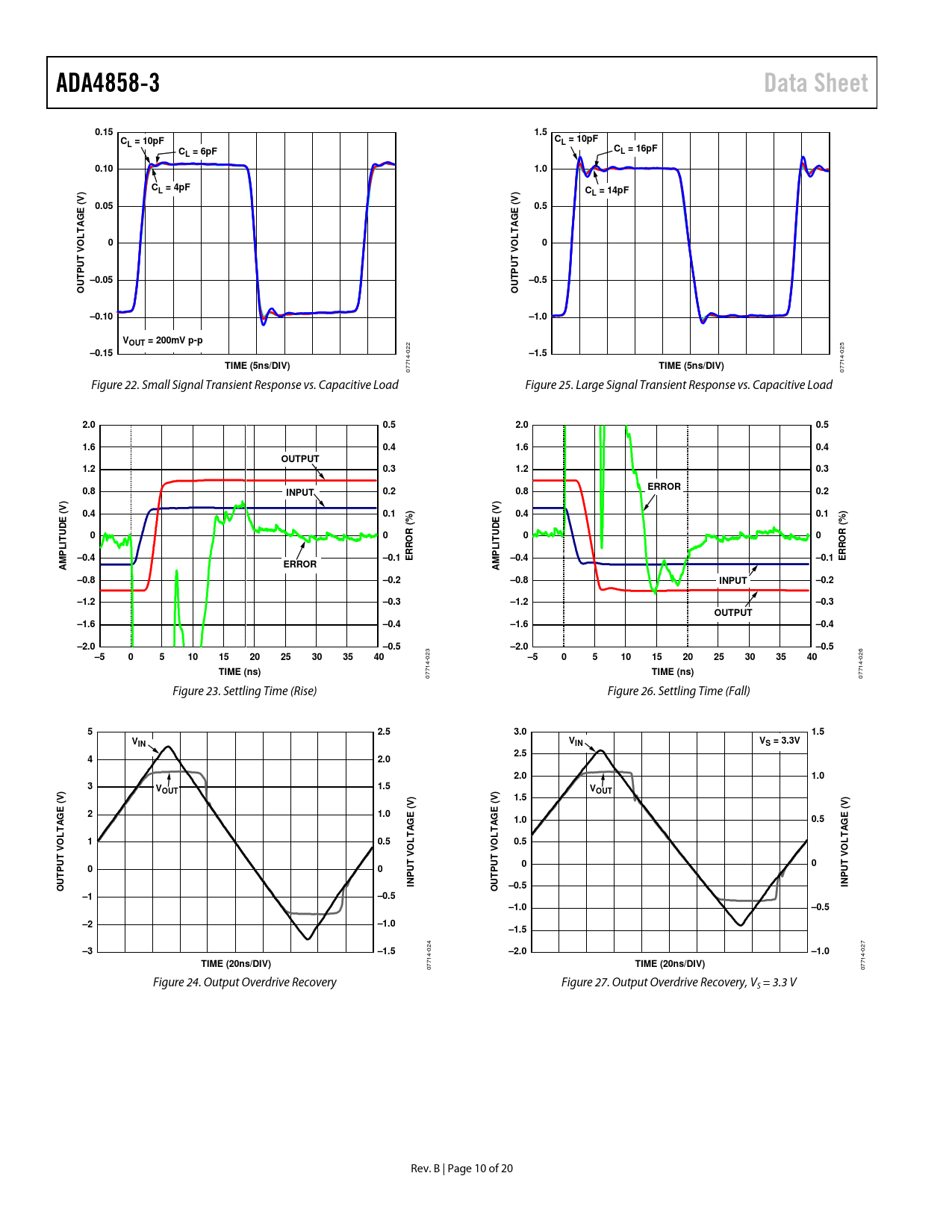 ADA4858-3Data Sheet0.151.5CCL = 10pFL = 10pFCCL = 6pFL = 16pF0.101.0C)L = 4pF)CL = 14pFVV(0.05(0.5GEGEOLTA0OLTA0T VT VUUTP –0.05TP–0.5OUOU–0.10–1.0VOUT = 200mV p-p–0.15 022 –1.5 025 TIME (5ns/DIV)TIME (5ns/DIV) 07714- 07714- Figure 22. Small Signal Transient Response vs. Capacitive Load Figure 25. Large Signal Transient Response vs. Capacitive Load 2.00.52.00.51.60.41.60.4OUTPUT1.20.31.20.3ERROR0.8INPUT0.20.80.20.40.10.40.1E (V)%)E (V)%)DDU00R (U00R (ITITRRORRO–0.4–0.1MPLE–0.4–0.1MPLEAERRORA–0.8–0.2–0.8INPUT–0.2–1.2–0.3–1.2–0.3OUTPUT–1.6–0.4–1.6–0.4–2.0–0.5–2.0–0.5–50510152025303540 023 –50510152025303540 026 TIME (ns)TIME (ns) 07714- 07714- Figure 23. Settling Time (Rise) Figure 26. Settling Time (Fall) 52.53.01.5VVININVS = 3.3V2.542.02.01.031.5)VOUT)VOUTV)V1.5)(V(V((21.0GEGEGE1.00.5GEOLTA10.5OLTA0.5OLTAOLTAT VT VUT VU00T V00UUTPPTPPININOU–0.5OU–1–0.5–1.0–0.5–2–1.0–1.5–3–1.5 024 –2.0–1.0 027 TIME (20ns/DIV)TIME (20ns/DIV) 07714- 07714- Figure 24. Output Overdrive Recovery Figure 27. Output Overdrive Recovery, VS = 3.3 V Rev. B | Page 10 of 20 Document Outline Features Applications General Description Connection Diagram Table of Contents Revision History Specifications Absolute Maximum Ratings Maximum Power Dissipation ESD Caution Pin Configuration and Function Descriptions Typical Performance Characteristics Theory of Operation Overview Charge Pump Operation Applications Information Gain Configurations DC-Coupled Video Signal Multiple Video Driver DC Restore Function Clamp Amplifier PD (Power-Down) Pin Power Supply Bypassing Layout Outline Dimensions Ordering Guide